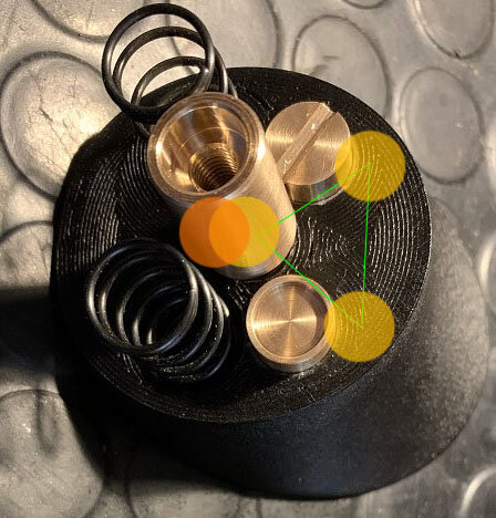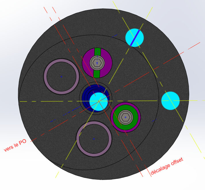 Formidable ! en effet, je suis toujours étonné de voir que ce concept ne soit pas davantage rependu (qui est pourtant en oeuvre dans les installations professionnelles). L'isostatisme est la base de la mécanique. C’est améliorable pour gagner en efficacité, pour que ce soit plus "mécanique, plus précis encore, il faut écarter les 3 points au maximum, ce qui est logique ! donc - tu fais le choix d'un pivot central (et qui semble pas ne être sur l'axe optique du télescope qui dans ce cas serait excentré de l'offset, le rond orangé) - dispose les 2 autres contacts (le trait et le plan) sur la base d'un triangle équilatéral la plus grande possible (les ronds jaunes) ici, tu est trop resserré au regard de ce qui est possible de faire, avec une base triangulaire particulièrement aplatie, ce qui n'est pas optimum. c'est comme pour un tabouret tripode : quelle est la configuration des pieds pour que ce soit le plus stable ? ben les plus écartés possible, et donc sur la base d'un triangle équilatéral. Après, on adapte en fonction, mais le concept est là. Be carreful : - le trait est à placer après une collimation réalisée, car il bloque irrémédiablement la rotation du système. (donc à coller ou à usiner le trait à la lime au final). - plus la rotule (le point) sera près du dos du miroir, moins les réglages n'auront d'influence quant au décalage de la position du secondaire. Tu peux améliorer le plan en conséquence. -