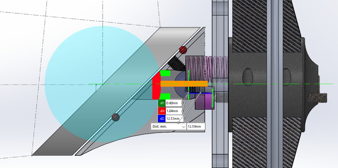 Yo ! il semble que tu as un angle entre les 2 vis de réglage assez important. Au grand maxi les 120° qui semblent couler de source, mais plus tu t'approcheras de 90°, plus tes réglages seront orthogonaux et donc facilités. Imagine la réciproque >>>> plus l'angle est grand, plus les 2 axes de réglages se resserrent et à 180°, ils se confondent.... En aucun cas, tu ne peux faire abstraction du "trait", sauf à avoir un autre système de bitée en rotation - ton ressort ne compte pas à ce jeu là !!!!! en tous cas, c'est bine mieux ainsi, j'ai envie de dire c’est sur la voie de la perfection (si tu resserres l'angle entre les 2 vis) -