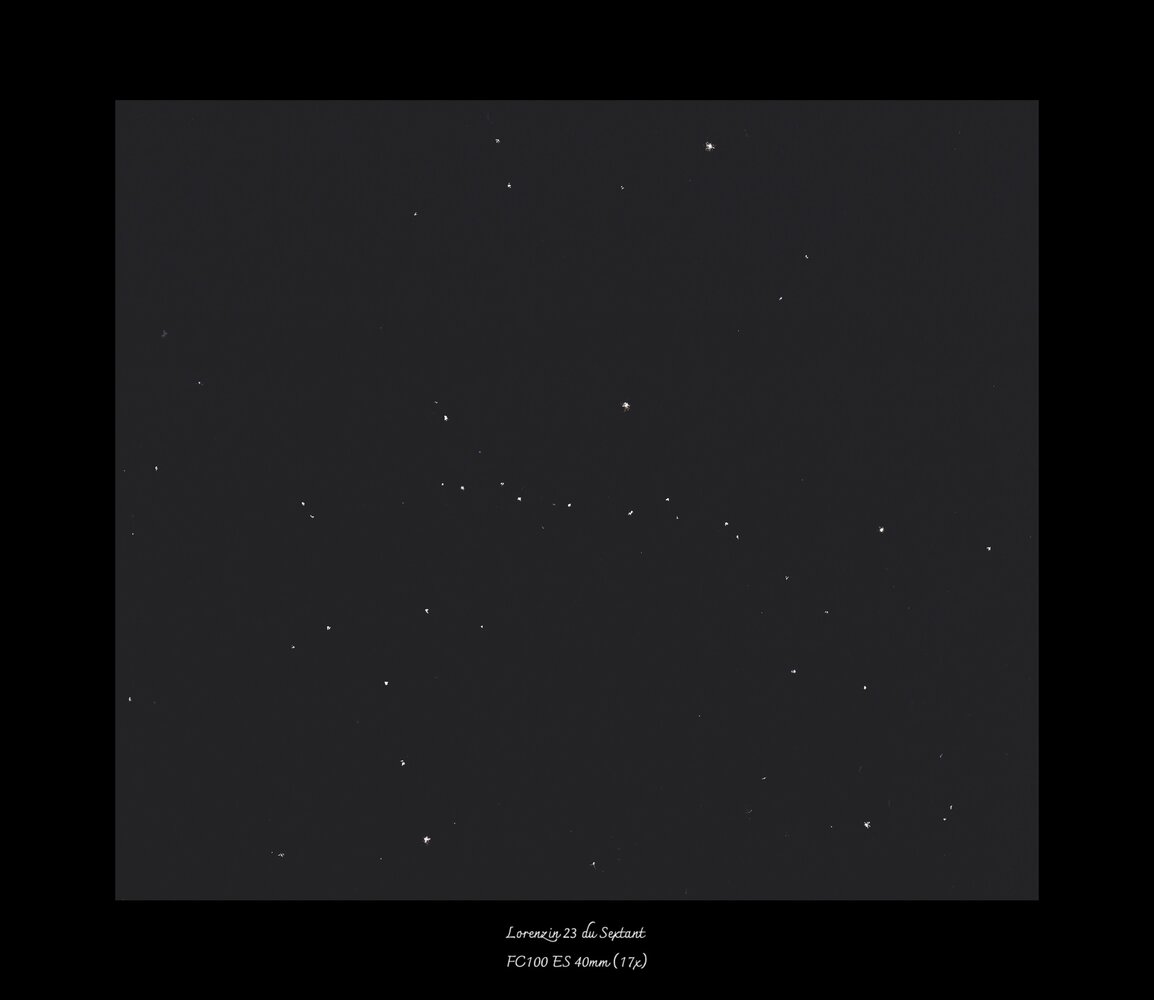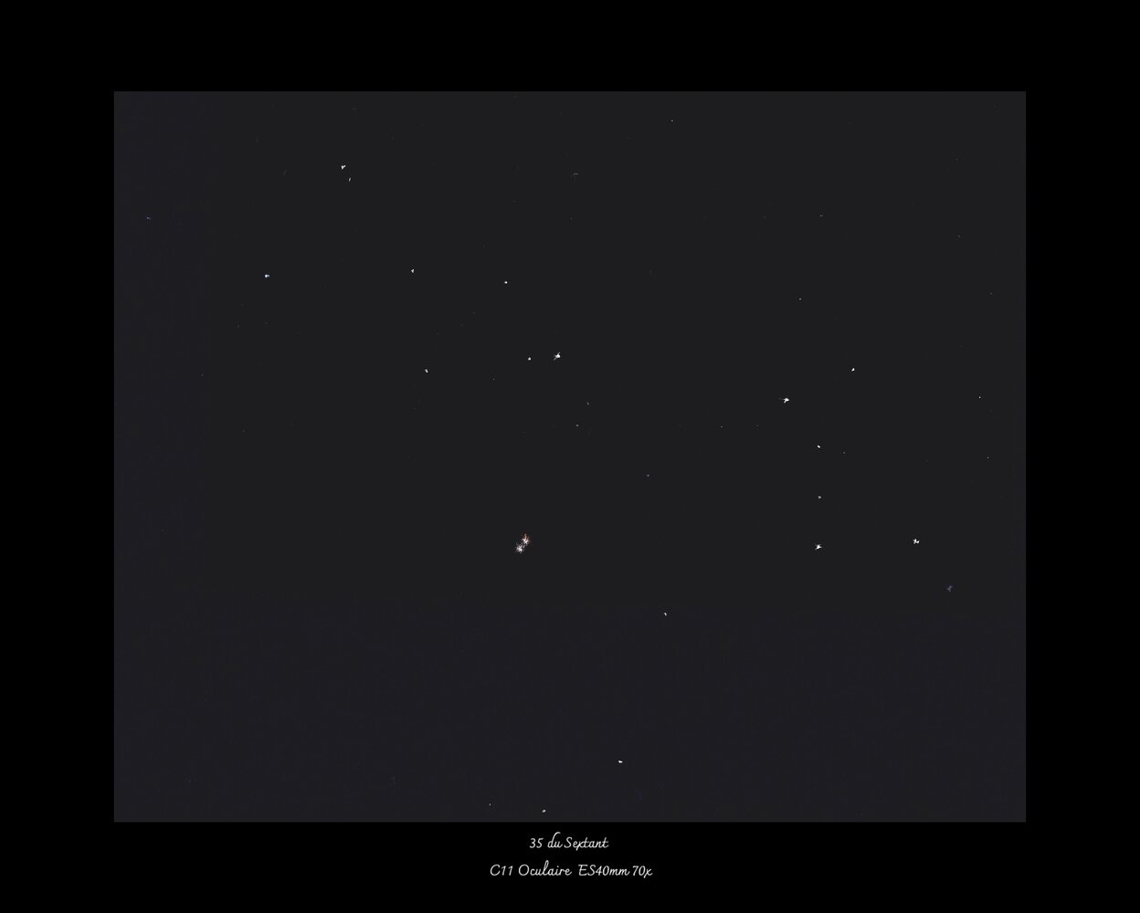 NGC 3044, 35 Sex, Lorenzin 23 Bonjour à tous, Voici une petite promenade du côté de cette toute petite constellation qui est à l'honneur ce mois-ci dans la revue Astrosurf. C'est à l'aide tout d'abord du C11 que j'ai examiné de plus près deux objets de cette région du ciel : une galaxie tout d'abord, NGC 3044 et une étoile double, 35Sex, facile à séparer mais tout de même, qui nécessité un certain grossissement... La galaxie NGC 3044. Voici d'abord une capture d'écran pour localiser cette lointaine galaxie : Entrons un peu dans les détails. Elle ne brille pas fort, 12,4 de magnitude, mais elle apparaît au final assez lumineuse au C11 et surtout c'est un très beau fuseau qui rend ce type d'objet si remarquable à contempler. Il est incomparable à la sublime NGC 4565 certes, mais cette galaxie mérite un petit temps d'arrêt. un noyau assez étiré se remarque sans peine et en vision décalée, le fuseau se prolonge assez loin de part et d'autre. Aucune zone sombre en revanche n'aura été distinguée. Etoile double 35 du Sextant. C'est une autre curiosité de cette constellation : une belle étoile double de couleur dorée et aux composantes assez brillantes, et de magnitude tout à fait comparable. (6,2 et 7,2). Un grossissement moyen suffit pour les séparer. Un bel astérisme : Lorenzin 23. Restons donc dans cette constellation pour observer un joli astérisme surnommé la cicatrice. C'est un bel alignement d'étoiles qui garde tout son esthétisme à condition de ne pas l'observer au C11 mais plutôt à l'aide d'un instrument qui autorise des grossissements bien plus faibles. J'ai donc opté pour la FC100 et. l'oculaire ES40mm pour obtenir 17X. Ce fut peut-être déjà trop. Voici une carte pour localiser cet astérisme : il faut regarder à l'angle de droite en bas. Voici une autre capture pour mieux le discerner au centre même de l'image : A la lunette, c'est au moins une dizaine d'étoiles qui compose cet objet. En revanche si on grossit davantage, on en voit encore un peu plus, mais, comme précisé plus haut, au détriment de la beauté d'ensemble. Voilà, c'est tout pour cette double virée du week end ! Bon ciel à tout le monde ! Gildas
