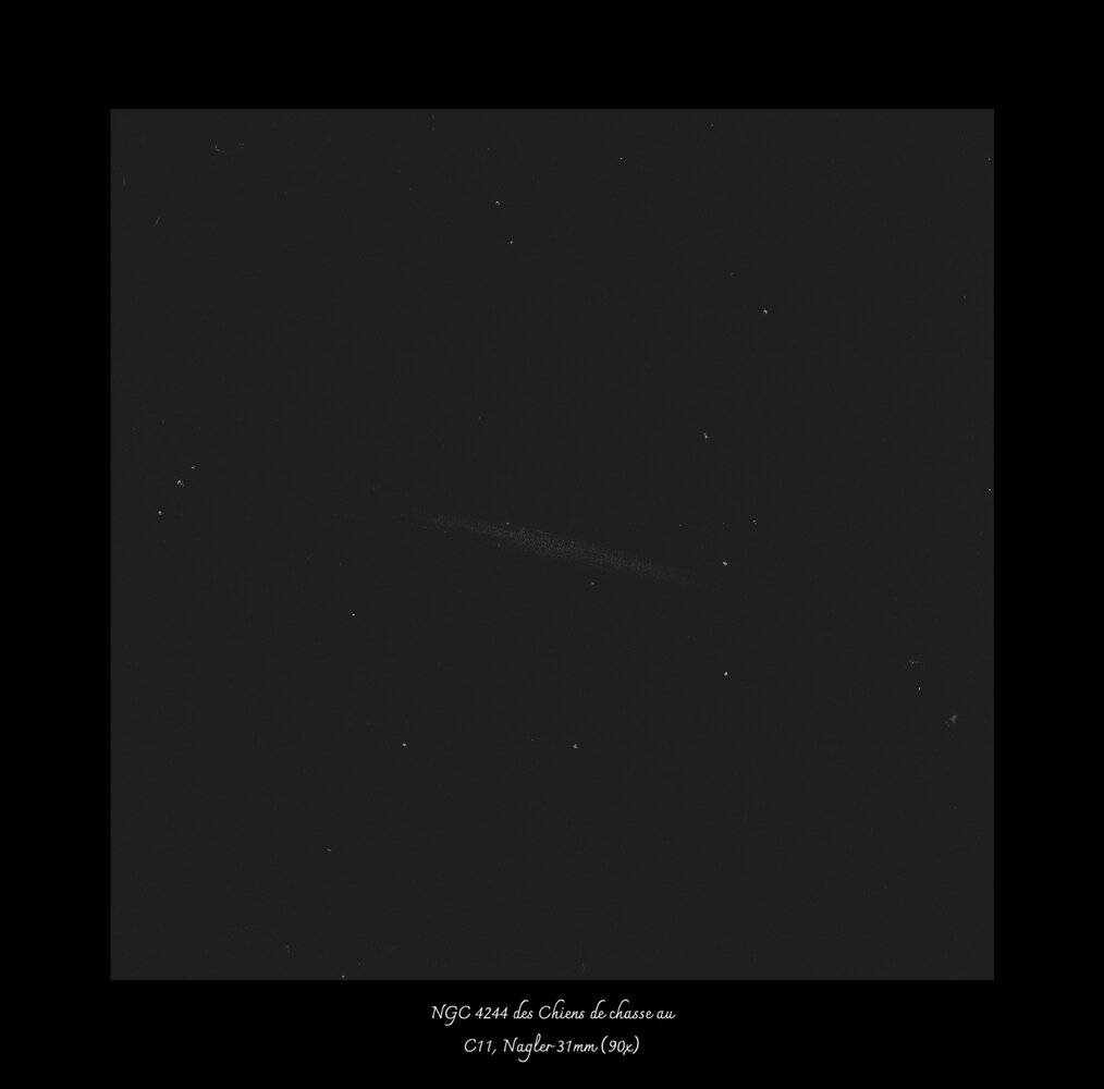 DU CÔTE DE LA CHEVELURE DE BERENICE ET DES CHIENS DE CHASSE Bonjour à tous, Jolie veillée sereine hier soir, histoire de prendre notre satellite de court ! Il fallait déjà attendre 23h pour qu'elle daigne enfin s'éclipser sous l'horizon. Mon précédent post m'a donné envie de revisiter la sublime galaxie dite de l'aiguille : NGC 4565 mais aussi de tenter celle dont il a été un peu question : NGC 4244 des Chiens de chasse. Pas facile facile cette dernière depuis le Tropique du Capricorne, mais elle ne fut pas si décevante que ça ! NGC4565 tout d'abord....Faut-il la présenter ? Elle n'a cessé de gagner en éclat au fur et à mesure que la blonde Sélène s'approchait de l'horizon...On dessine donc, et on contemple... NGC 4244 que je ne connaissais pas, faute au ciel austral, m'aura valu une belle surprise : certes elle est pâle par rapport à NGC 4565, mais on voit un joli fuseau avec un noyau très étalé, peu contrasté. J'imagine que l'image obtenue à l'oculaire doit être plus flatteuse dans l'hémisphère nord, mais ravi tout de même de cette découverte. Merci à Bruno et Etoilesdesecrins ! Bon ciel à tous en ce début de printemps ! Gildas
