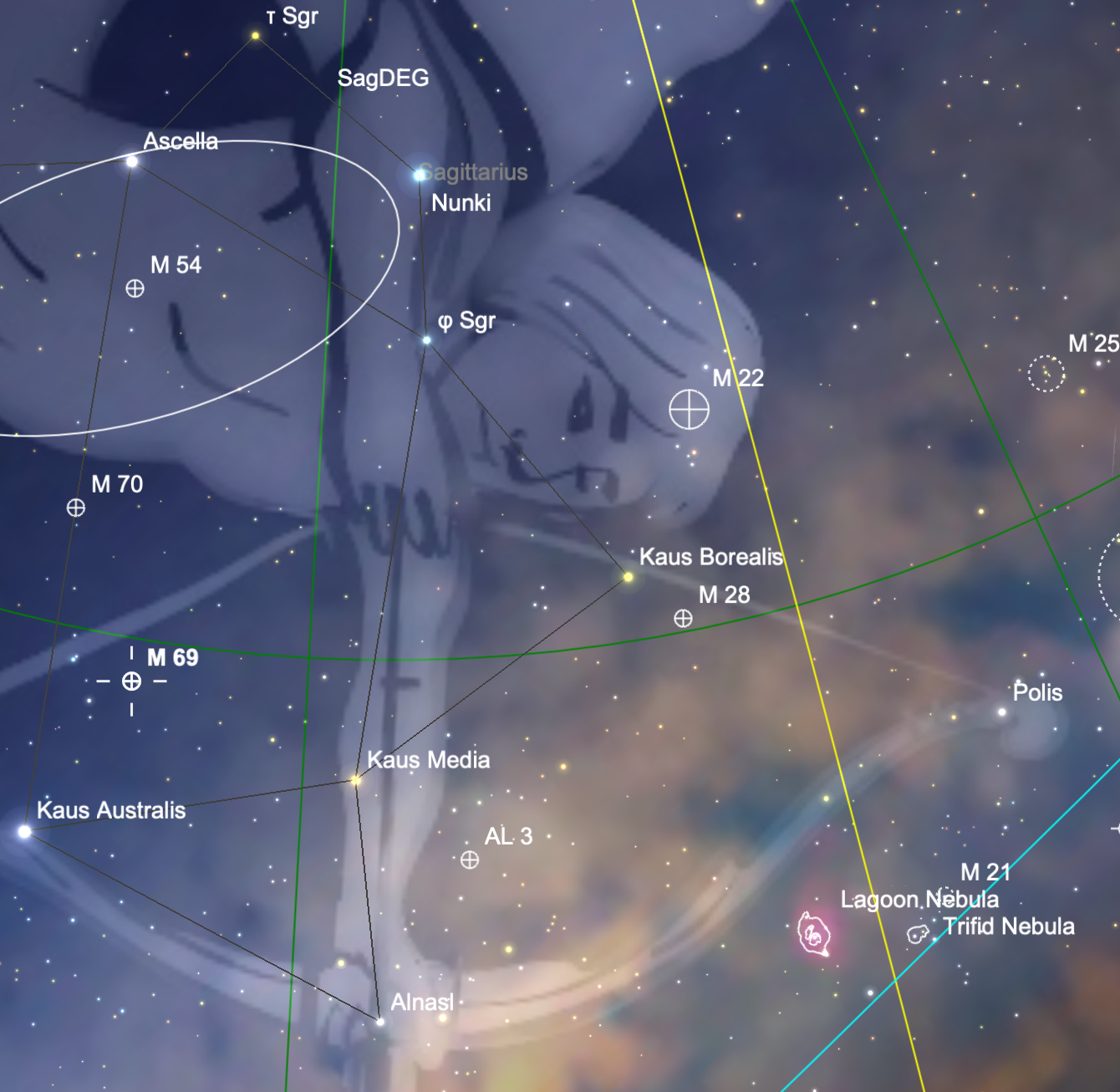 Messier 69 et Messier 20. Bonjour à Webastro ! Une jolie promenade hier soir sous un ciel clément et pur ! L'été métropolitain ou l'hiver austral va peu à peu se retirer même si la fraicheur ici est bien encore de mise et heureusement ! J'ai donc fait une petite promenade dans la constellation du Sagittaire à une heure assez tardive, tandis que le constellation emprunte sa descente vers l'horizon ouest, au-dessus de l'océan. La nébuleuse Trifide. Un classique que j'ai tant de fois visité ! Peu importe, c'est toujours un éternel plaisir de contempler un tel joyau dans l'espoir de percevoir un détail supplémentaire ! Bon, là, "no way" comme on dit, ce serait même la tendance inverse avec l'acuité visuelle qui n'ira pas en s'améliorant ! Voici une carte qui permet de localiser la nébuleuse et l'autre objet de la soirée : Messier 69. Les chenaux de la nébuleuse sont visibles sans la moindre difficulté avec des nuances dans les nuées qui valent le détour. La zone la plus dense est au coeur du trèfle. L'étoile centrale est tout aussi aisément résolue. L'amas globulaire : M69. Ce n'est pas l'amas globulaire le plus saisissant de la zone avec comme concurrent M22 pour ne citer que l'un d'entre eux ! Toutefois il est sublime. J'ai opté pour un tout petit grossissement, X70, histoire de vérifier si on distingue déjà ce léger poudroiement qui fait toute la beauté de ces objets célestes. Voici le dessin : Voilà, je me suis égaré ensuite vers l'aigle et son cygne, ou bien encore M11 que je préfère volontiers à la lunette car trop résolu au C11, avec des étoiles trop séparées les unes des autres. Voilà, sauf fatigue indomptable, j'y retourne ce soir mais probablement avec ma belle lunette ! Bon ciel à tous !! Gildas