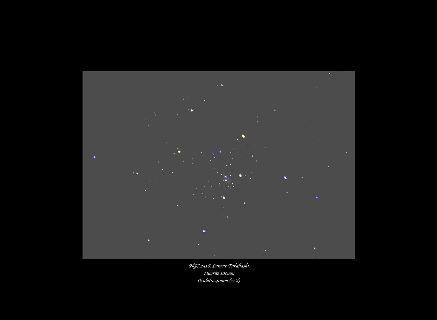 NGC 2516 DE LA CARENE Bonjour à tous, Côté météo, bon, c'est pas encore le top, mais un répit de la saison des pluies m'a permis avant hier de réitérer l'observation de ce bel amas de la Carène : NGC 2516. Je l'avais observé il y a quelques jours au C11. Force fut de constater que cet amas se prête bien plus volontiers à un joli grand champ comme l'autorise à faire la lunette. Une petite fraicheur annonciatrice de l'entre saison m'invite même à mettre un pull histoire d'observer paisiblement à proximité d'un bananier on ne peut plus exotique ! Revenons à ce qui est sans doute plus intéressant : l'amas NGC 2516. Il brille à près de 3,8 points de magnitude. Ce qui le rend particulièrement beau, c'est cette présence de géantes rouges orangées qui semblent encadrer le tout. L'amas est dense, et, sans la lune levante, nul doute que le nombre d'étoiles eût été encore plus élevé. Il m'aura fallu déjà près d'une heure pour représenter une partie de cette ruche. Cet amas offre aussi à plus fort grossissement quelques jolies doubles serrées qui mériteraient cette fois une observation plus attentive au...C11. Encore que, la lunette excelle en ce domaine également. Pour rappel une capture d'écran pour situer l'objet : Et voici le dessin avec en parallèle une photographie. J'ai terminé ma veillée du vendredi soir par une belle double qui se trouve à proximité de cet amas : Vathors Prior. Celle-ci méritera une petite observation plus attentive. La météo se gâte à nouveau pour les prochains jours : un nouveau système sans danger pour la Réunion mais qui transite sur Madagascar, occasionnant des bandes périphériques....Bref, nulos de chez nulos pour ce qui est de l'astro. Bon ciel à tous ! Gildas.