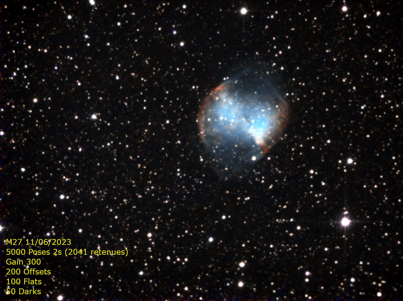 7. Bonjour à tous, second essai toujours avec 130/650 SW, HEQ5 Pro, Caméra ASI 224MC, GAIN 300 et partant de 5000 images de 2secondes. 200 Offsets, 50 Darks et 100 Flats Traitement SIRIL et GIMP. Je pense que je pourrais avoir encore plus de détail car mon PC ne sait ouvrir que 2041 fichiers en mm temps et donc je ne sais aligner que 2041 images sur le 5000 prises. Si quelqu'un sait sur Windows 11 comment faire pour l'augmenter... je n'ai pas encore trouvé. Merci pour vos avis et retour. je mets aussi une brute et le fichier sorti de Siril si ça interesse quelqu'un Light_ASIImg_2sec_Bin1_24.2C_gain300_2023-06-11_031632_frame4967.fit M27_Sorti_SIRIL.fit
