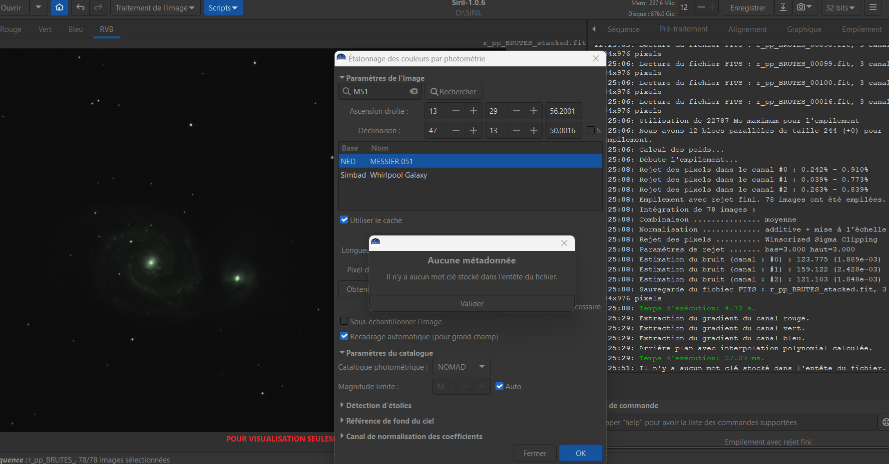 18. Je refais un traitement des mes images 20secondes. PRemière chose, lorsque je convertissais les fichiers, je n'avais pas cocher, dematricages... de ce que j'ai compris il n'y a plus qu'un seul canal. Par contre toujours le même message voici le print screen, c'est plus simple dès que j'appuie sur "obtenir métadonnée de l'image" j'ai ce message.