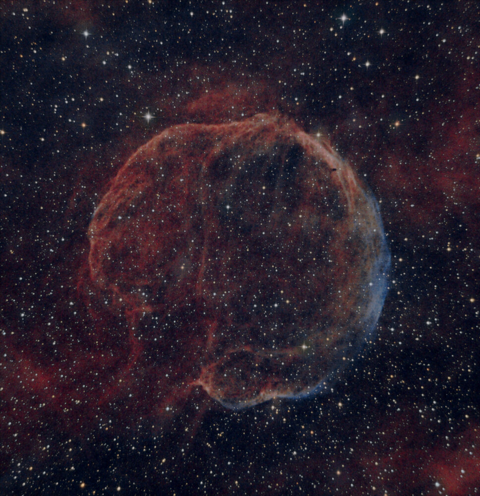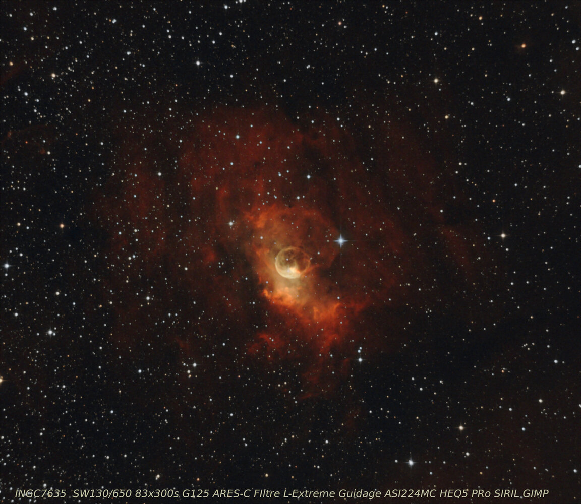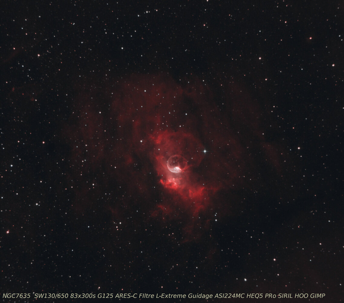 BOnjour, comme plusieurs... la nuit passée fut la bulle 83 poses de 300s avec filtre l-extreme. Toujours avec camera Player one Ares-C refroidie -10°C Filtre l-extreme Guidage ASi224MC sur lunette 60/240. Traitement Siril et GIMP Première version en HOO (j'ai du mal avec les histo en Ha et OIII Seconde version en traitement standard Siril et Gimp Vos avis constructifs sont bien entendu les bienvenus. Perso, je vois pas pourquoi je me casse le c** avec les extraction Ha et OIII alors que je préfère la seconde version ...🤣