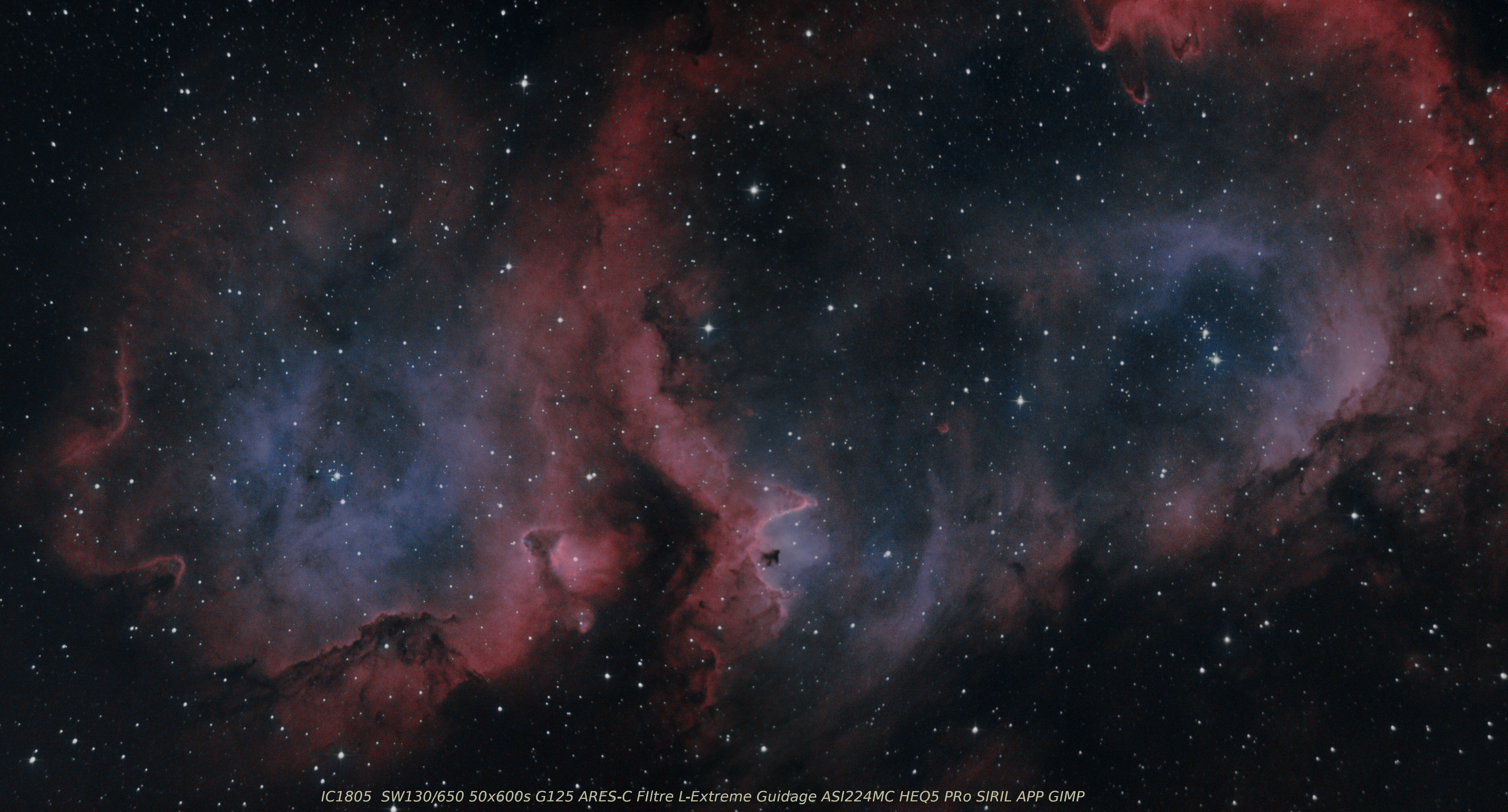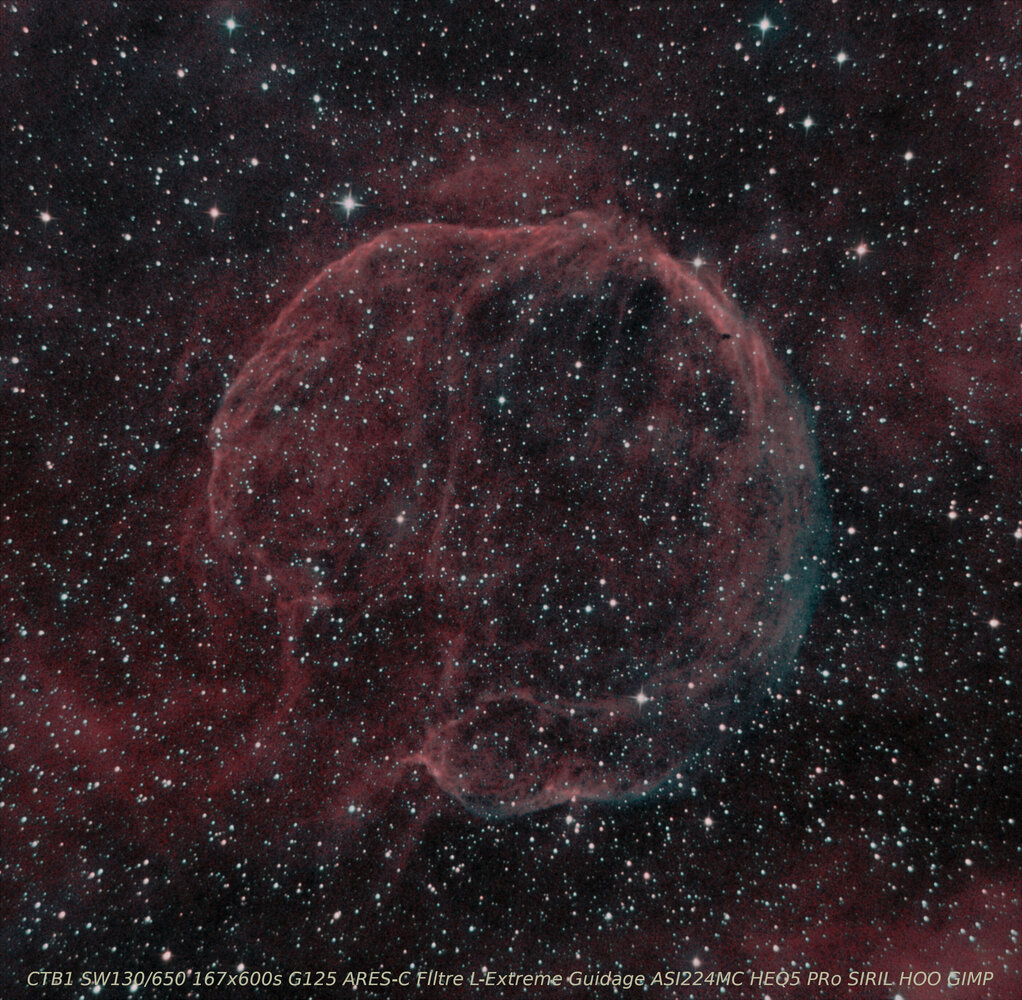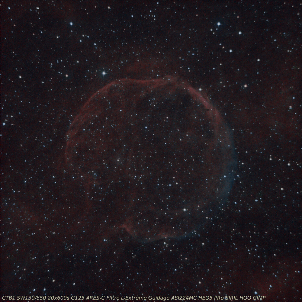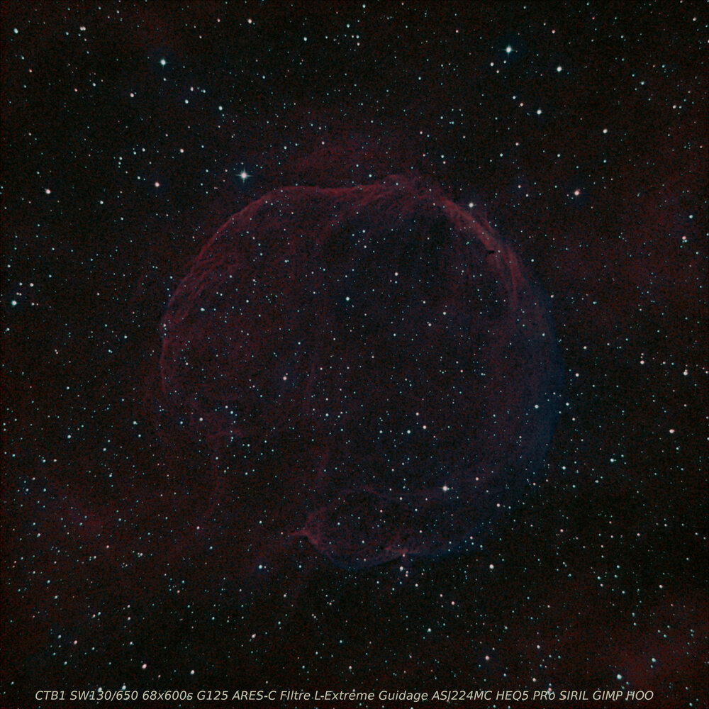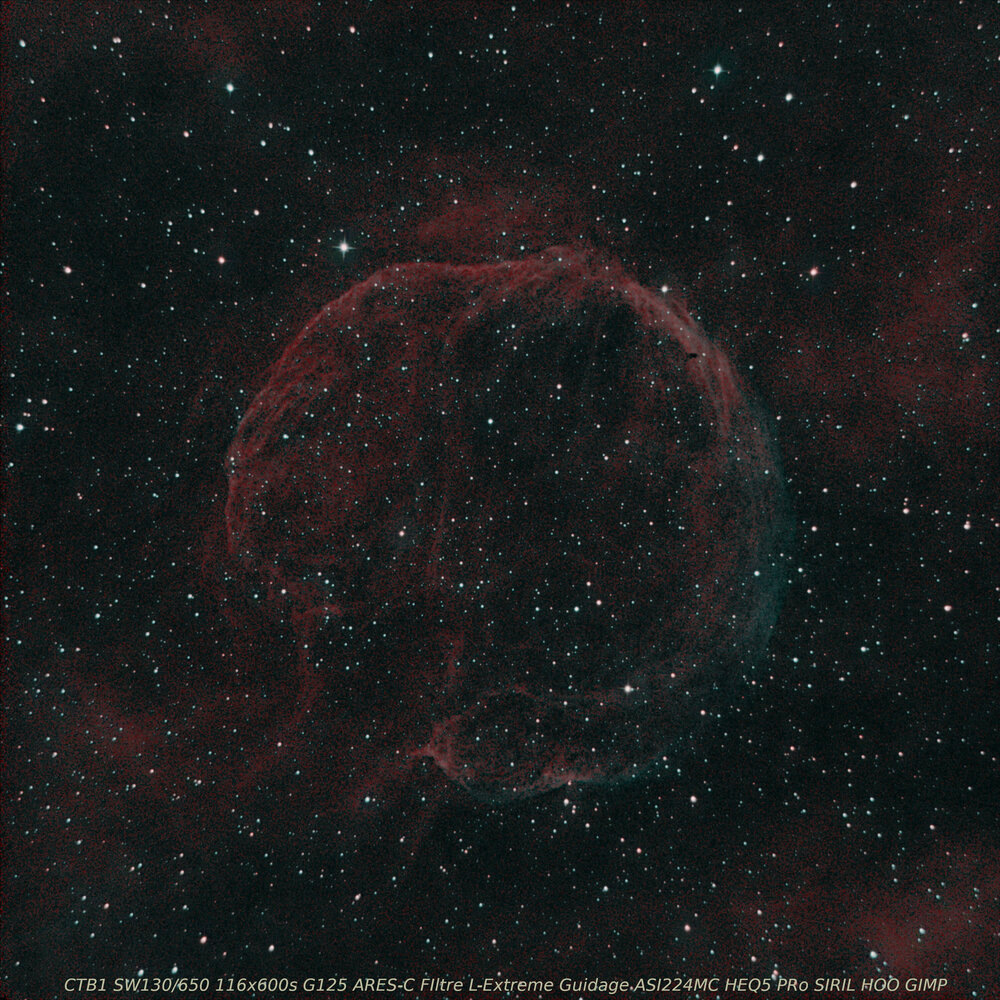 Bonjour, alors j'ai repris quelques poses sur CTB1 la nuit passée... je n'ose pas sortir mon matos cette nuit... pas confiance dans la météo vu que ça semble se dégrader... même si le radar de nuage semble dire que ce serait top... Du coup j'ai ajouté 48 poses à mes 20poses précédentes de 600s chacune. Filtre l-extreme et camera refroidie -10°C. Je remet en dessous la première version aussi il manque encore des poses.. Traitement SIRIL HOO + GIMP Première avec 20 poses