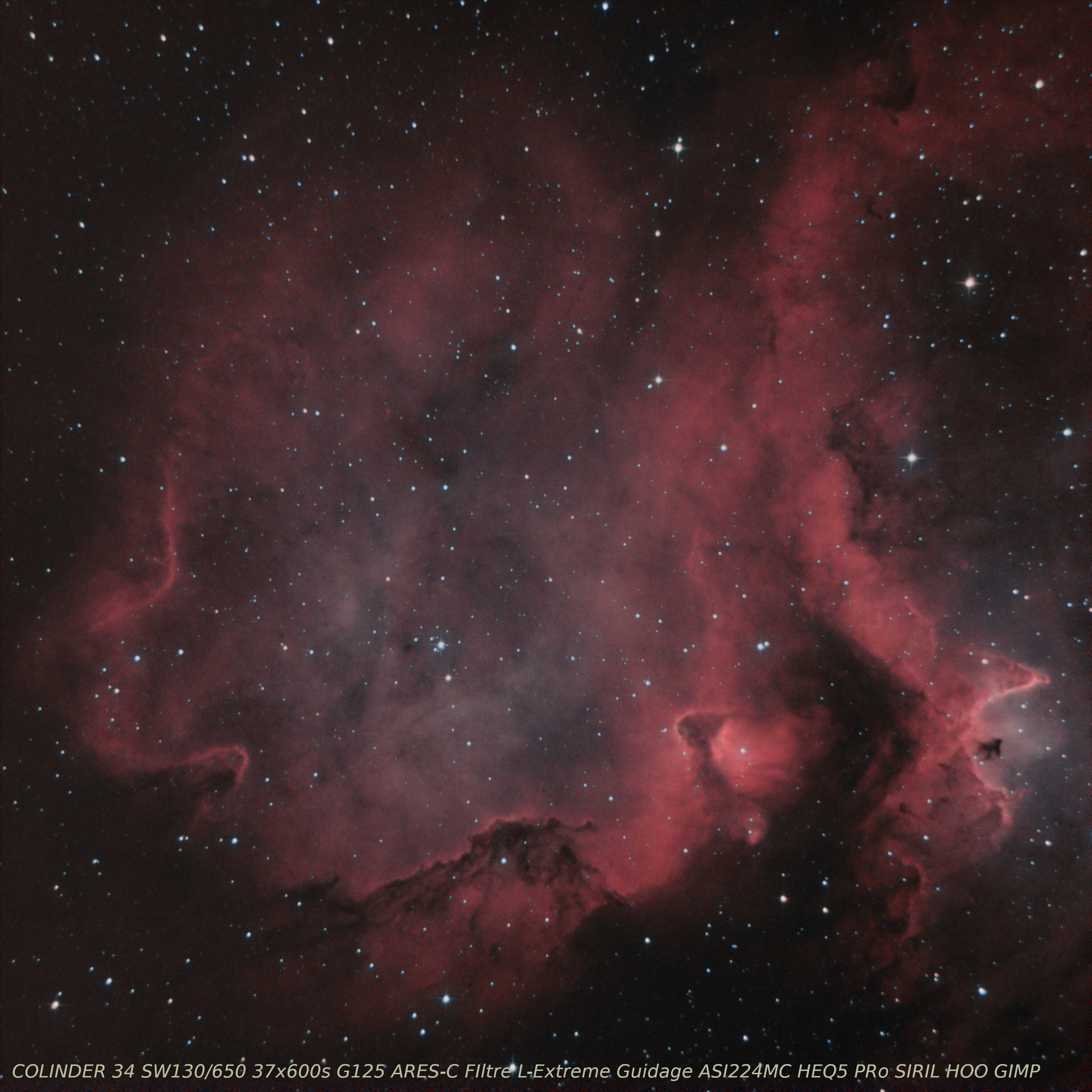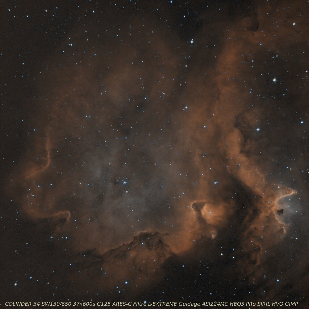 Bonjour à tous, profitant d'un peut bout de nuit, j'ai pu prendre 37 poses de 600s d'une partie de la Nébuleuse de l'âme Collinder 34. J4ai fait deux versions, HOO pure et une que j'appelle maintenant HVO, la couche verte est faite avec pixelmath en 0.5*HA et 0.5*OIII. Caméra refroidie Ares-C Pro couleur et filtre L-extreme. JE reste ouvert aux critiques constructives Version HVO Version HOO