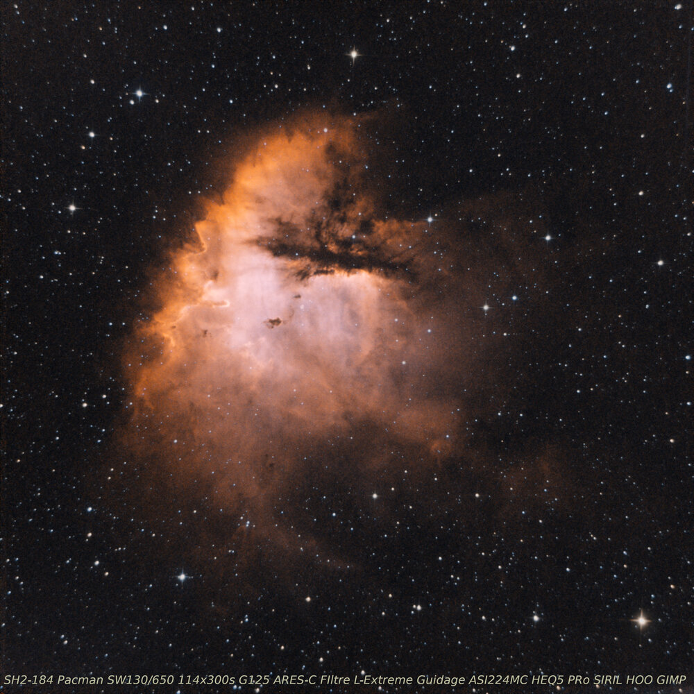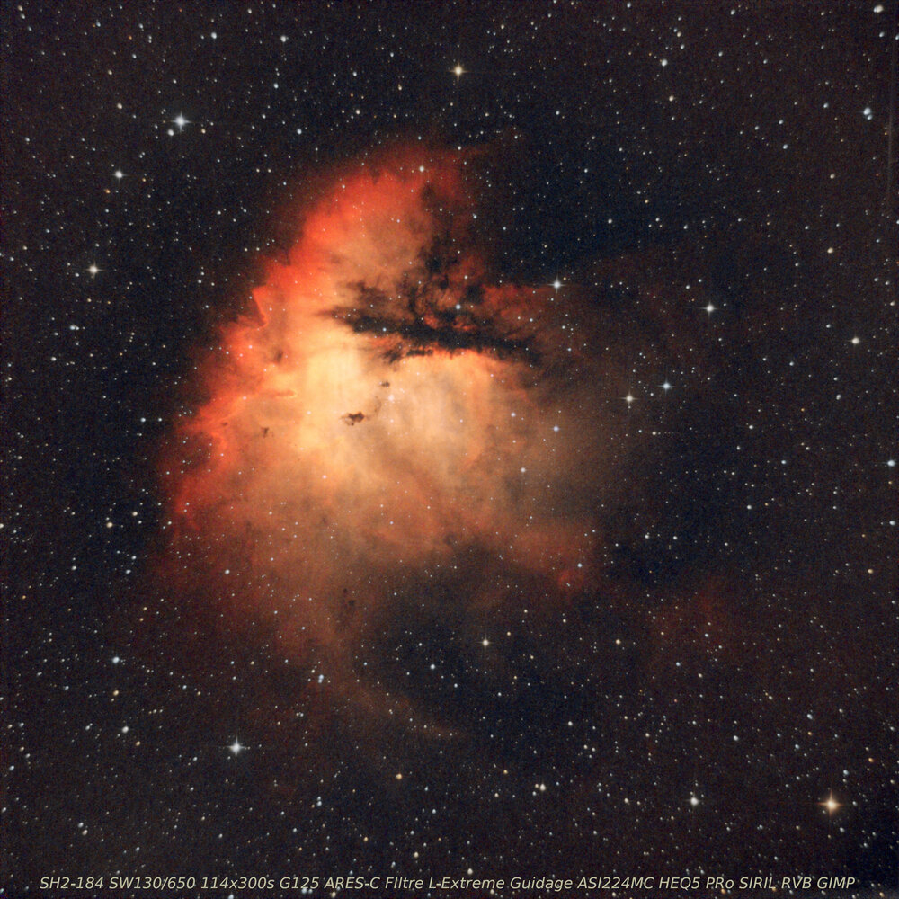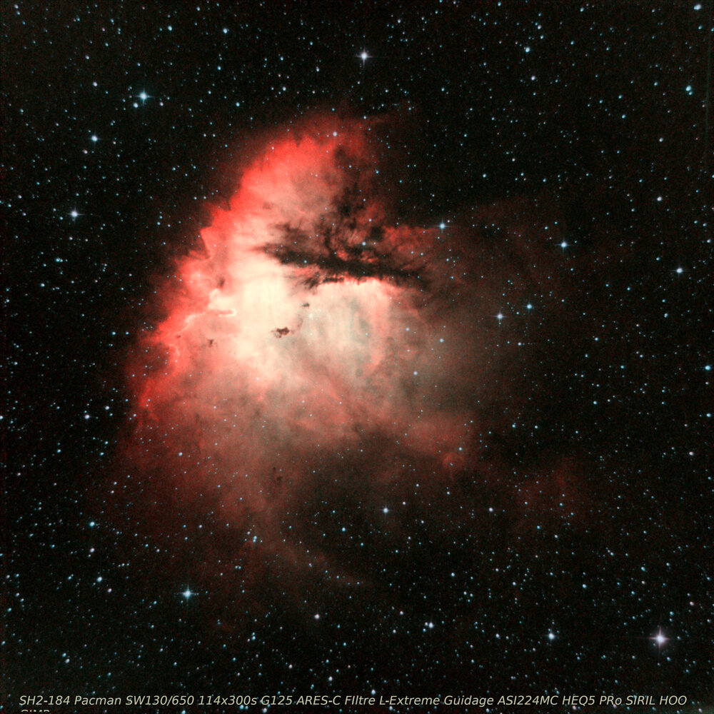 Bonjour à tous, voici donc la nébuleuse SH2-184 dit aussi la nébuleuse de Pacman (perso je ne le vois pas :)) J'ai donc pris cette nuit 120 poses de 300s avec filtre L-extreme. SW130/650 avec camera refroidie Ares-C Pro et un guidage par caméra ASI224MC et une lunette guide 60/240. J'ai réalisé 3 traitements : - Traitement SIRIL avec Extraction Ha/Oiii et composition HOO + GIMP - Traitement SIRIL avec Extraction Ha/Oiii et composition HOO mais la couche verte combinée par Pixelmath à 0.5*Ha et 0.5*OIII + GIMP - Traitement SIRIL normal RVB + GIMP Personnellement je préfère la seconde version avec la composition pixelmath de la couche verte. merci pour vos retours 1. HOO 2. HOO avec couche verte pixelmath 3. RVB Standard