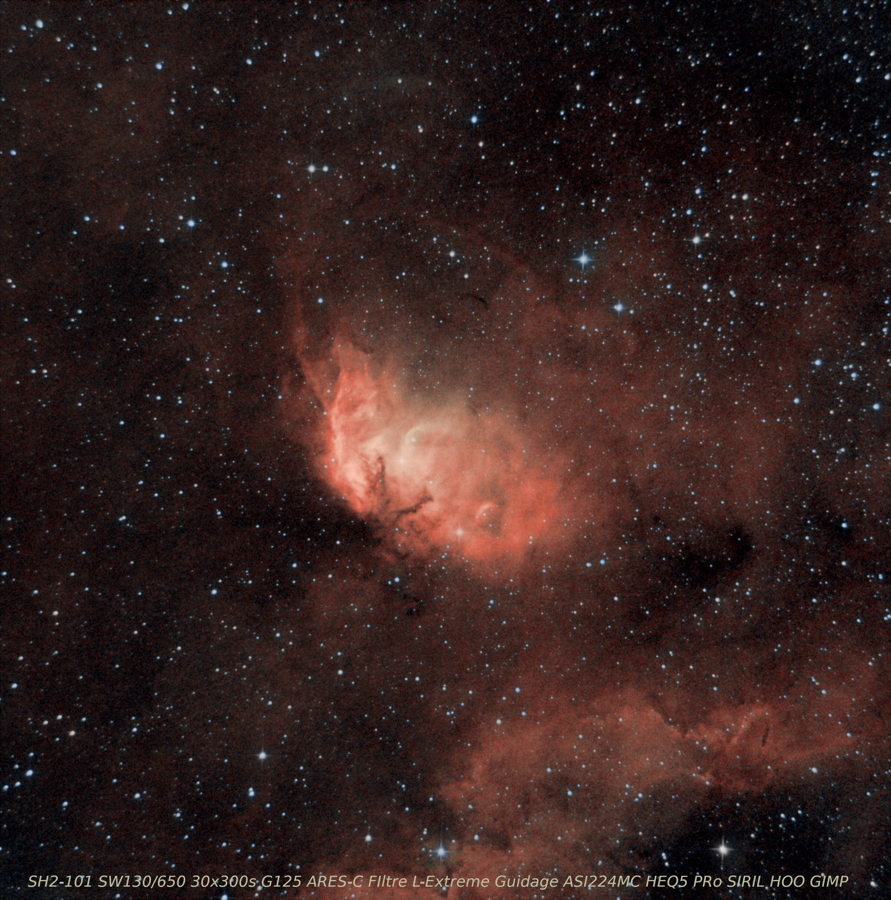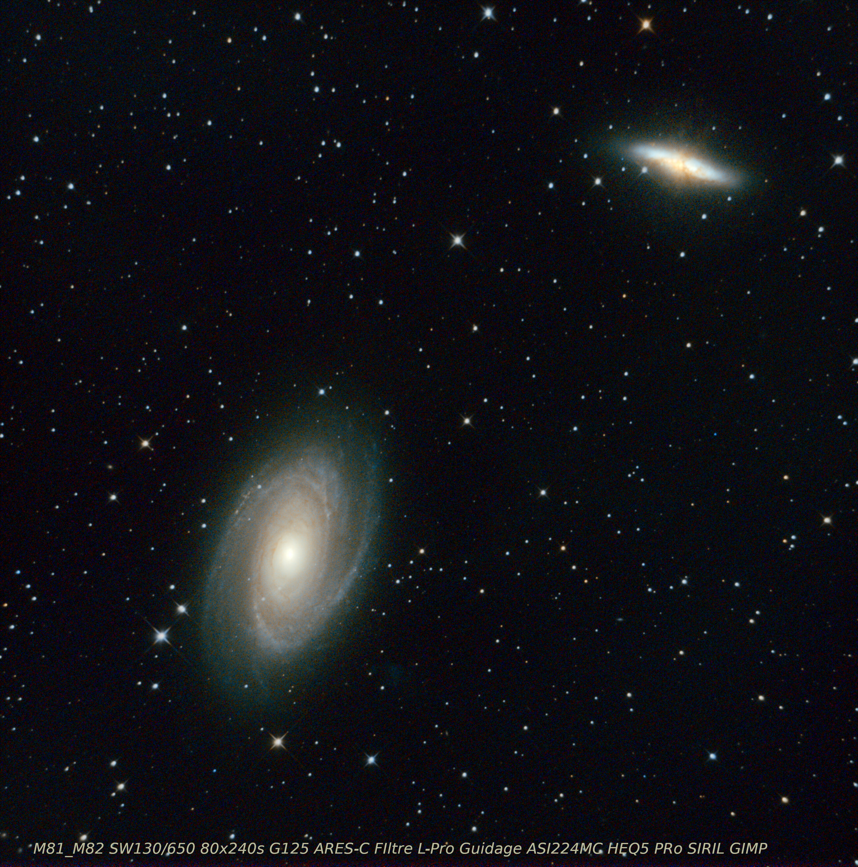 Bonjour à tous, après des mois sous les nuages, j'en ai profiter pour ressortir le matériel la semaine passée avec les quelques nuits sans trop de nuage. matériel SW130/650, avec camera refroidie Ares-C et autoguidage ASi224MC. J'ai donc recommencé avec M101 et un filtre L-PRO, 32x600s sur une nuit. Traitement avec Siril et GIMP uniquement La nuit suivante j'ai fait M82/M81 toujours avec filtre L-PRO, 80x240s sur une nuit. Traitement avec Siril et GIMP uniquement Pour terminé, j'ai pris la tulipe avec filtre L-Extreme, 31x300s, j'attends la prochaine éclaircie pour faire la même prise avec filtre SII pour faire le traitement en palette Hubble SHO. Ici traitement HOO Siril + GIMP N'hésitez pas à me faire vos commentaires, cela faisait longtemps et le traitement reste à mon sens mon plus grand axe d'amélioration. Tiger