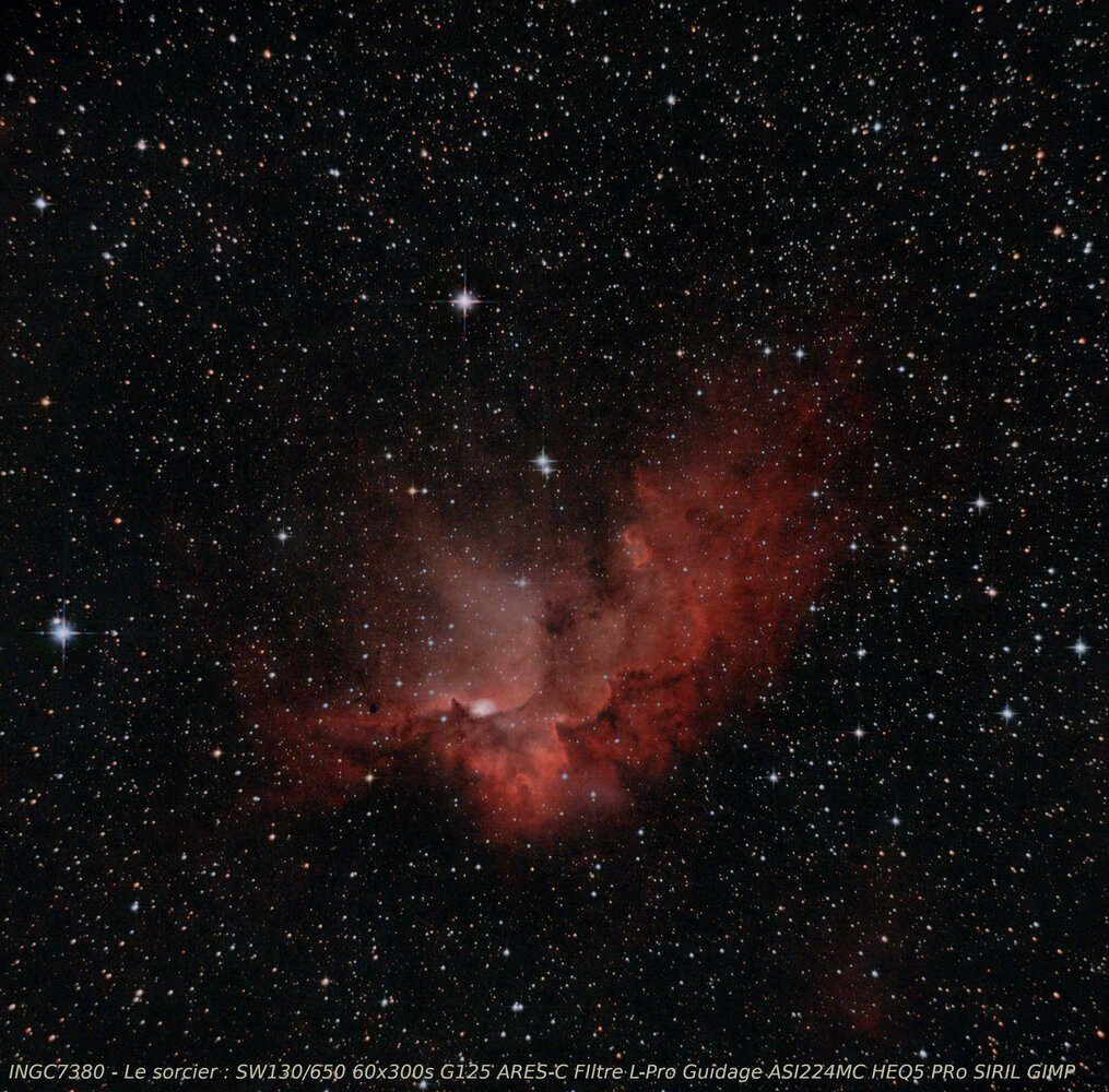 Vu les critiques acerbes de @C14edgeHD, je suis obligé d'être transparent !!! (Humour ) Voici sorti traitée SIRIRL, extraction Gradient, colorimétrie, transformation ASINH et légère montée histogramme Ensuite voici la starless directement équivalent Ici le traitement avec uniquement une diminution d'étoile, si ça ne convient toujours pas à MONSIEUR, c'est que ma légère montée en histogramme dans SIRIL est déjà trop grande... dans ce cas, je te mets le fichier directement sortie empilement et tu fais ce que tu veux avec MDR! (j'avoue un peu de saturation en plus, mais rien de plus ! Evidemment à prendre avec humour je préfère avoir des avis et comprendre les points de vue. NGC7380_le Sorcier_60x300x_G120_ARES-C_21_08_2023.fit -