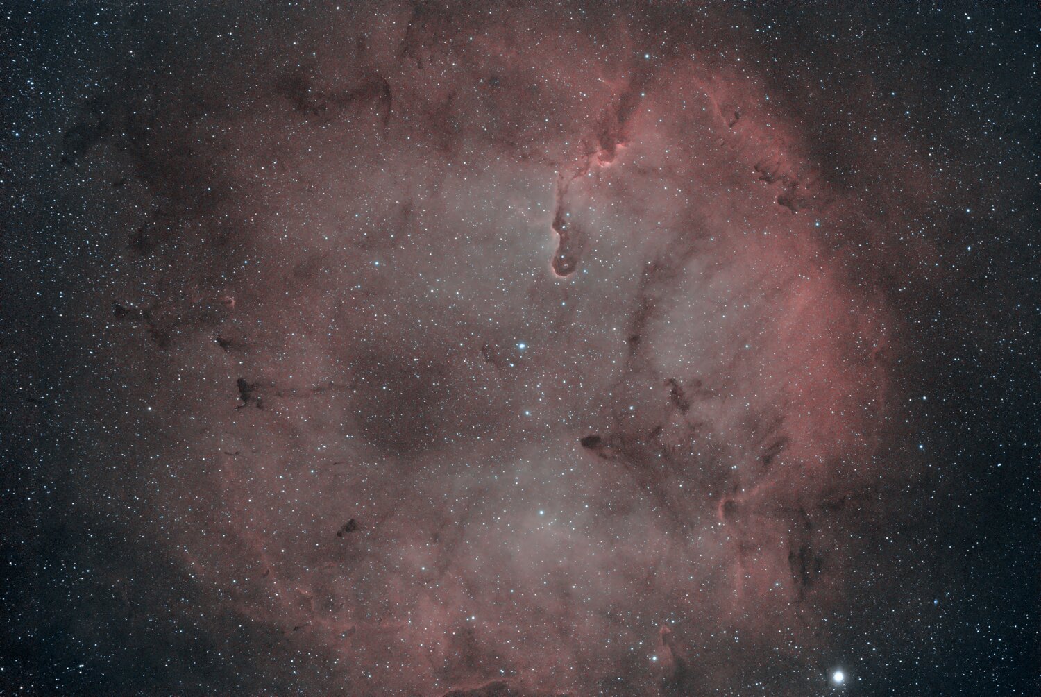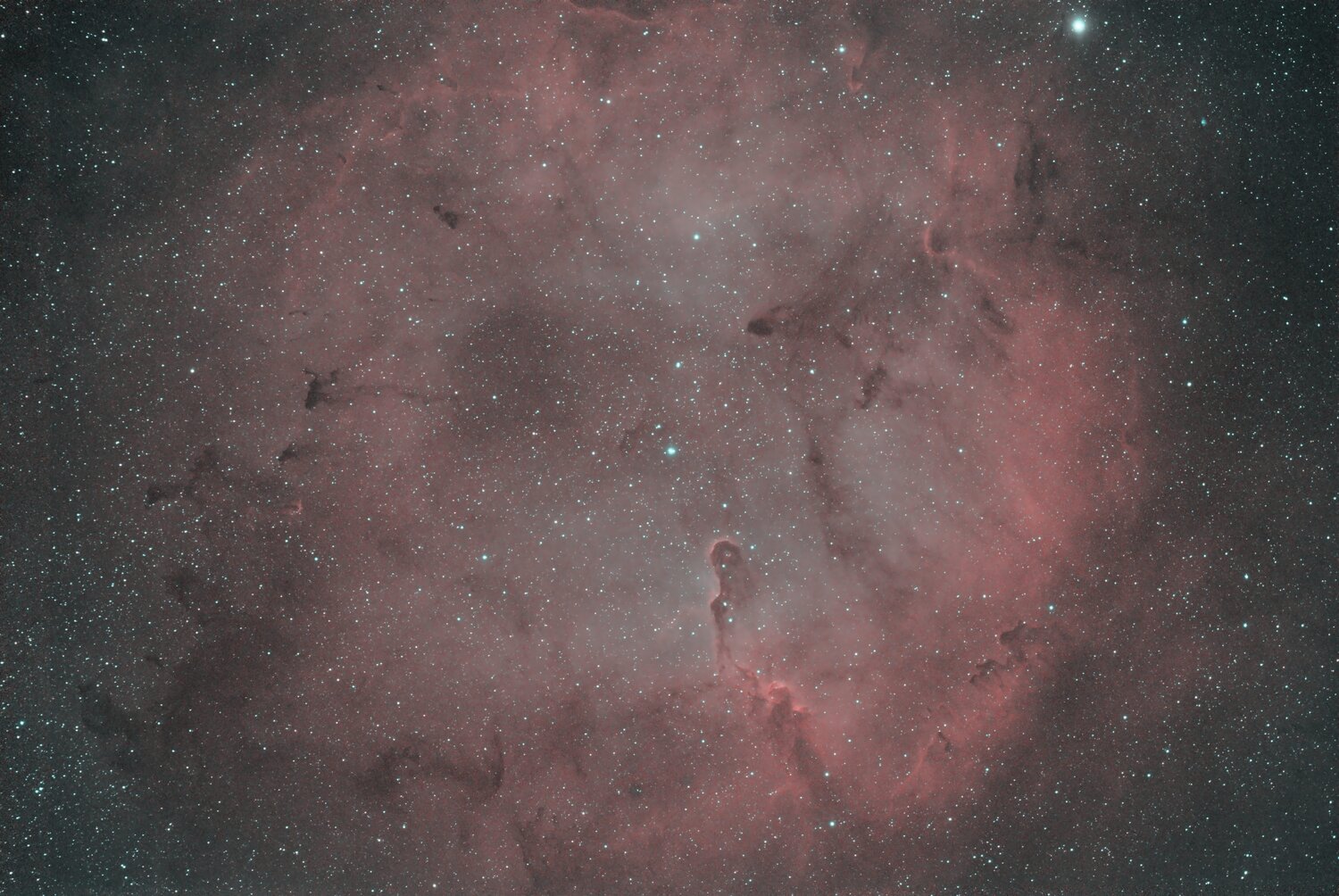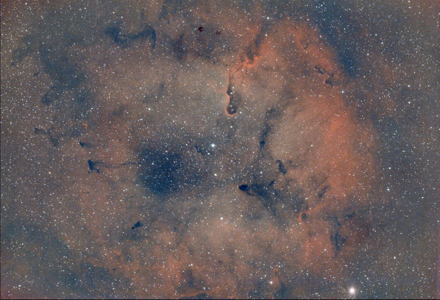 Hier soir, je voulais imager le coeur, IC1805, avec ma RCIMX571MC. Mais le matin même, lorsque j'ai voulu faire des darks, la cata, la cam ne répondait plus. Le premier dark se composait d'une bande noir au bas de l'image, environ le tiers de la hauteur, et par dessus 3 panneau identique grisâtre ! Redémarrage du Stellarmate, changement de câble, etc, rien n'y fit. Imaginez ma tête ! Pour ne pas perdre la soirée, je l'ai remplacé par une ASI533MC, avec son champ réduit. 40 poses de 240 sec à -10°C, avec filtre Antlia Ha-OIII 5 nm. Pas de DOF, je les ferais ce soir. Pre-traitement HOO avec Siril V1.4 Linux. Post-traitement Pix Linux 1.9.8. Ce matin, j'ai vérifié que la cam fonctionnait normalement sur mon PC ou sur le RPI5. Ce soir ce sera donc avec RPI5+powerbox Gemini !