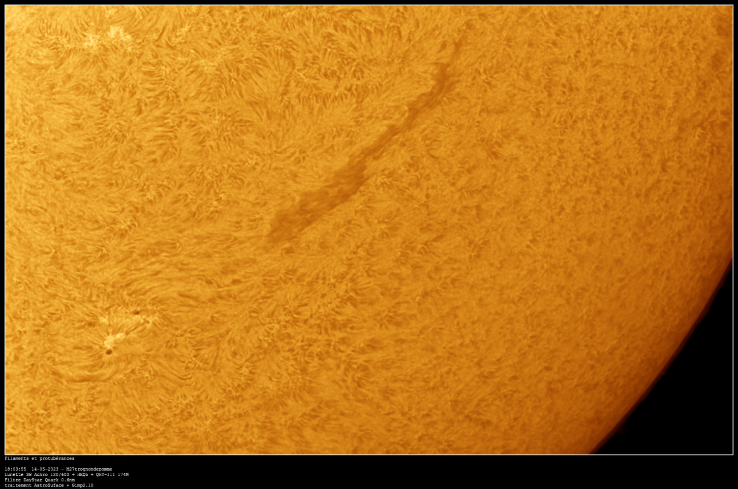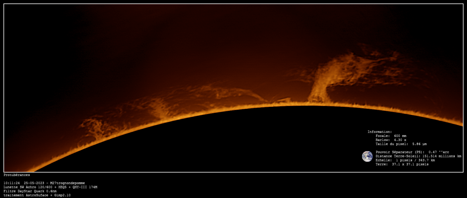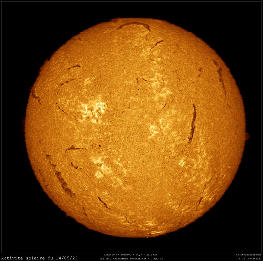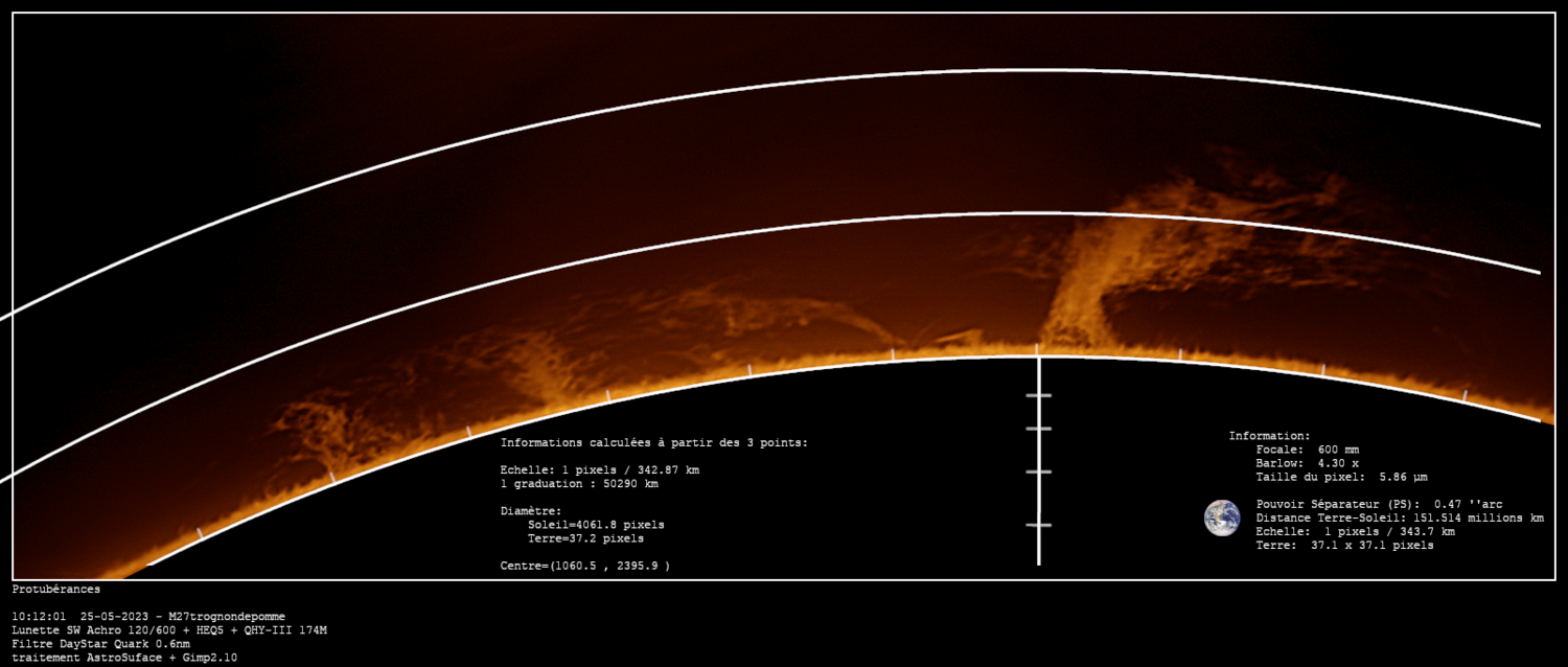 Au début, je faisais avec la caméra QHY174 car elle était légère mais ce n'était pas terrible. J'ai repassé avec l'asi183: L'échantillonnage était plus favorable. Cependant faire du Ca II K ou H, c'est relativement sombre : la mise au point de la lunette sur la fente est plus difficile. Il ne faut pas hésiter à saturer un peu de part et d'autre de la raie. Pour le traitement, j'utilise en manuel mon logiciel pySolarScan car la détection des bords de soleil échoue souvent en automatique car l'image est sombre. Vers 17h, j'ai sorti le télescope pour faire un peu de LB dans le continuum 540nm :