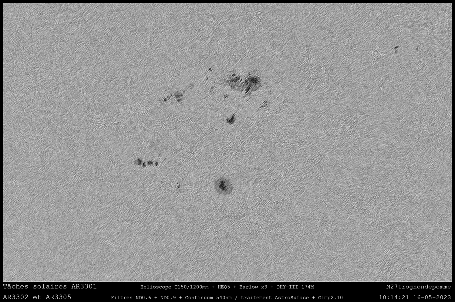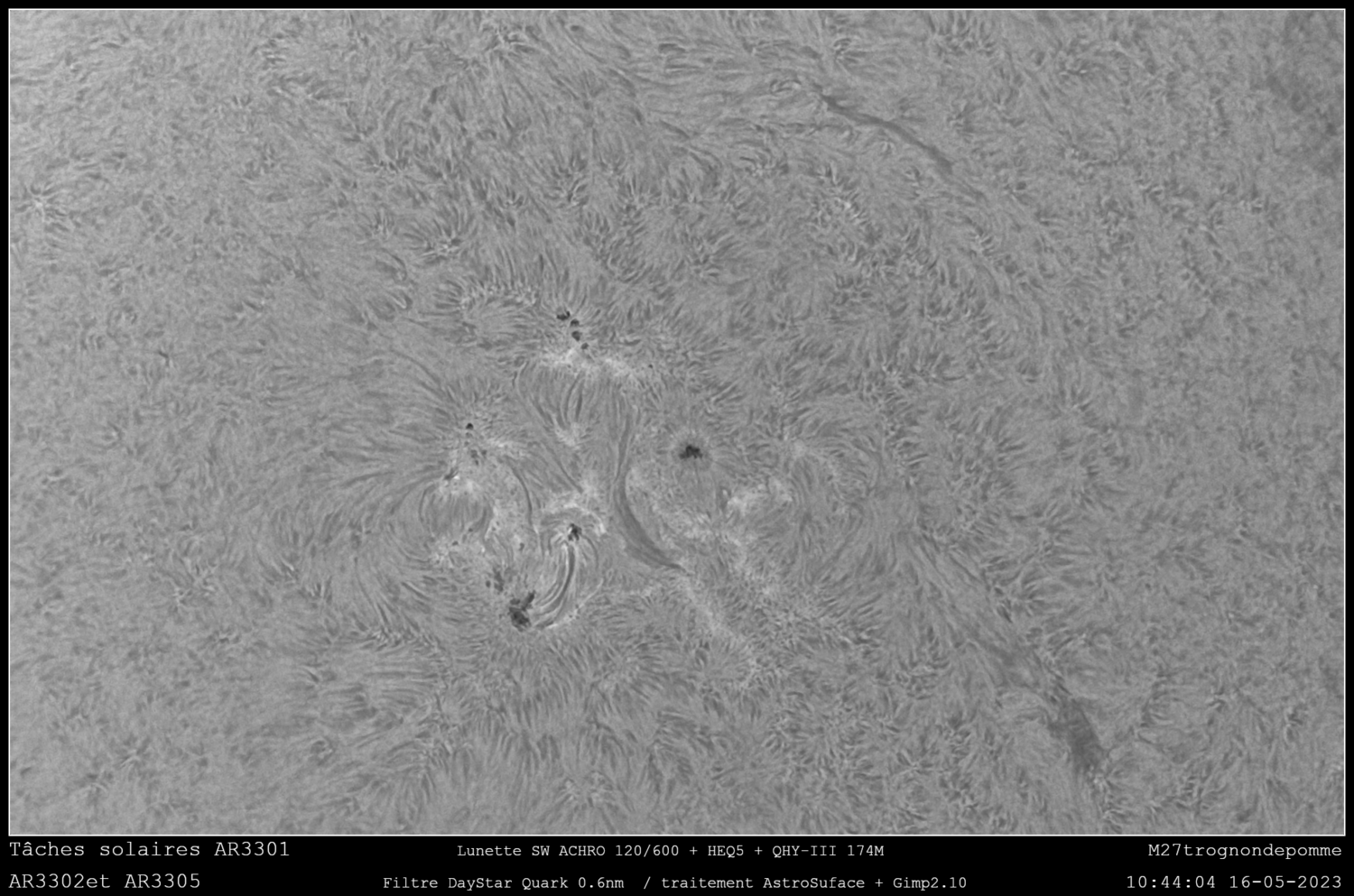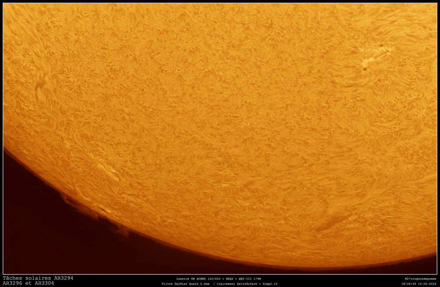 bonsoir à tous, en fin d'après-midi, le ciel était dégagé du voile nuageux de la journée et je décide de sortir le matos mais le temps de se préparer , les nuages se sont invités. J'ai eu juste le temps dans une trouée nuageuse de faire une vidéo de AR3310 en lumière blanche . J'ai empilé 25 images sur les 1000 images de la vidéo. version colorisée: version NB -
