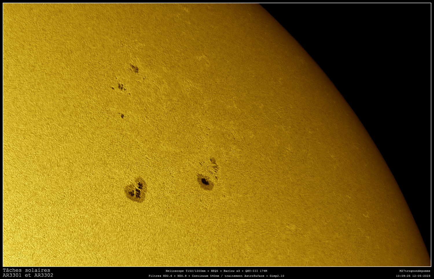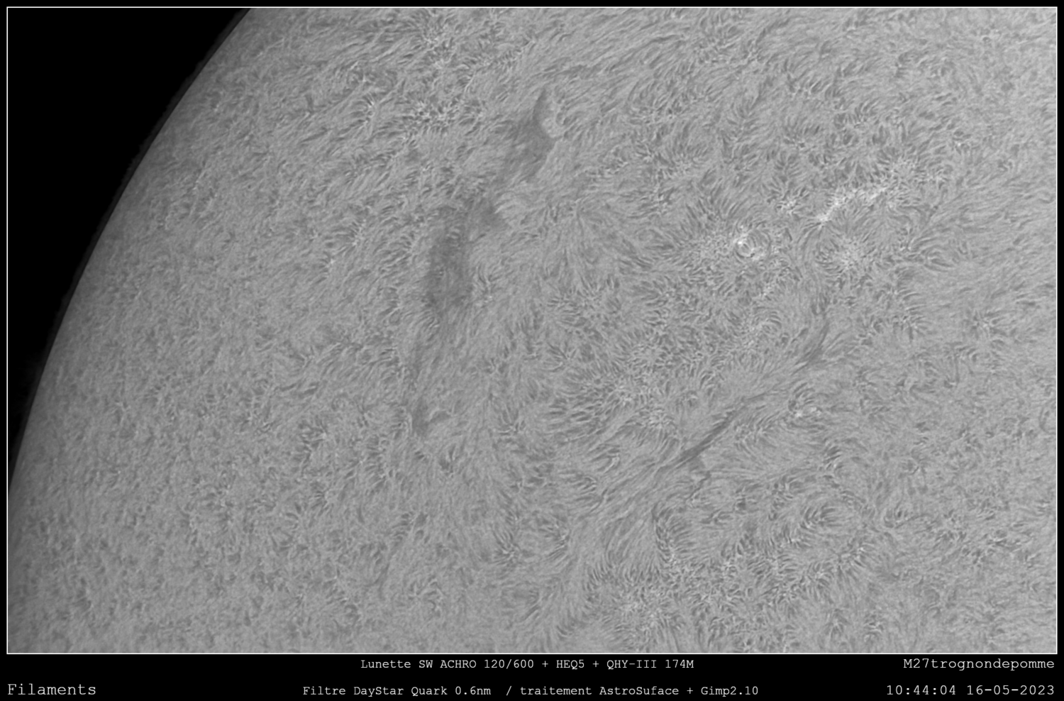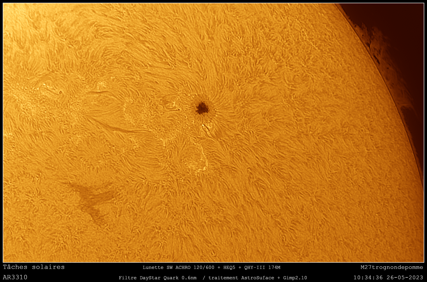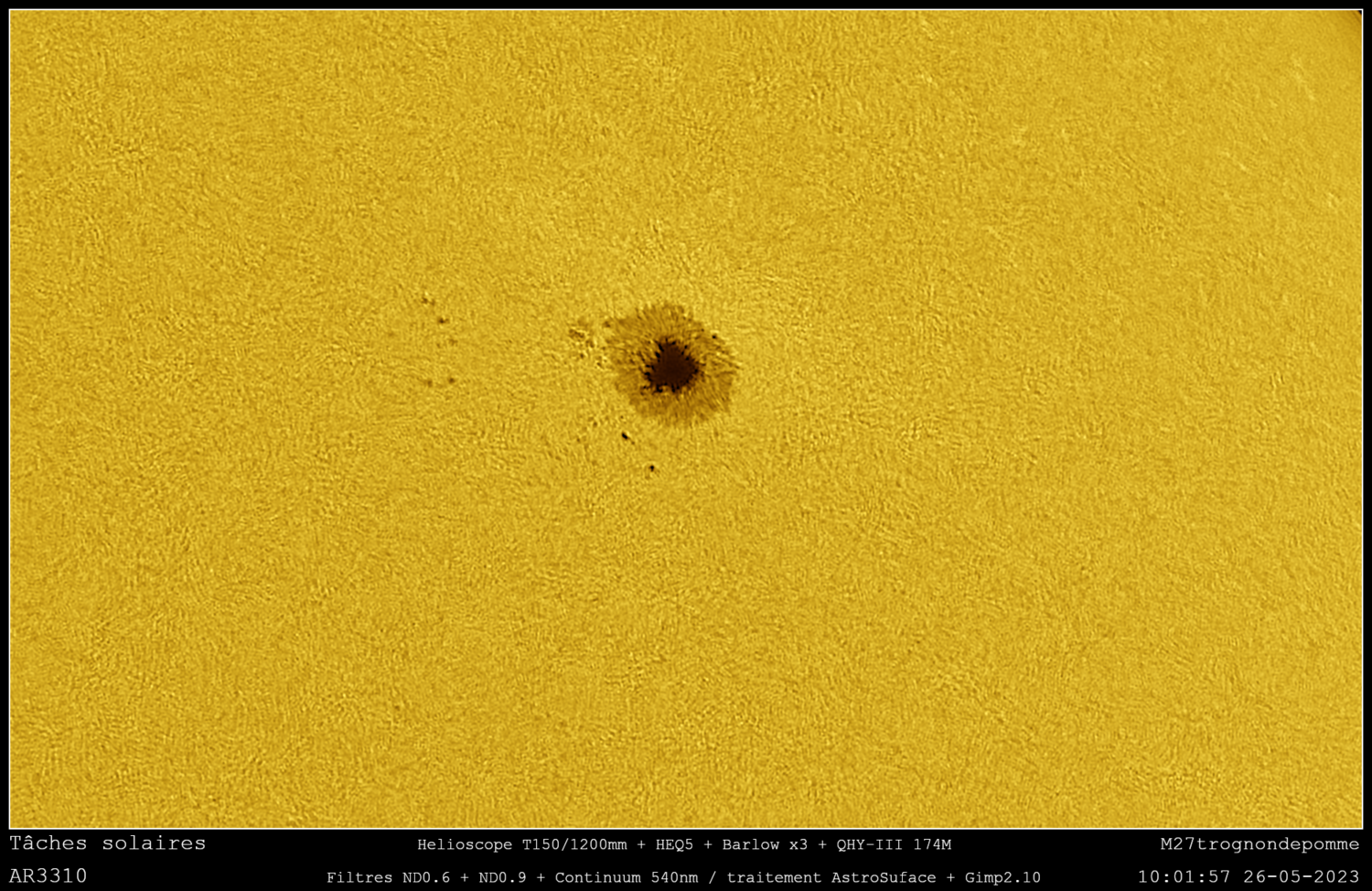 bonsoir à tous, en fin d'après-midi, le ciel était dégagé du voile nuageux de la journée et je décide de sortir le matos mais le temps de se préparer , les nuages se sont invités. J'ai eu juste le temps dans une trouée nuageuse de faire une vidéo de AR3310 en lumière blanche . J'ai empilé 25 images sur les 1000 images de la vidéo. version colorisée: version NB -