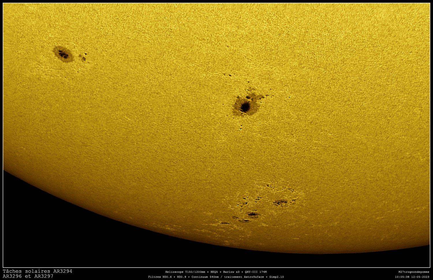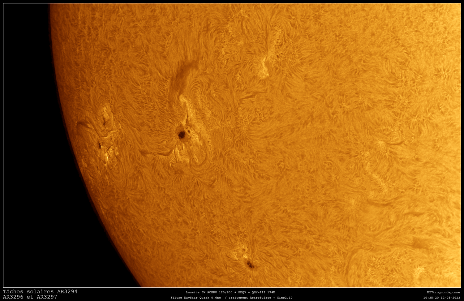 Bonjour à tous les passionnés de Soleil, voici des images des groupes de tâche du jour : AR3294, AR3296 et AR3297 en LB AR3294, AR3296 et AR3297 en HA AR3301 et AR3302 en LB AR3301 et AR3302 en HA Des filaments et des protubérances -