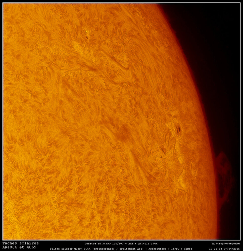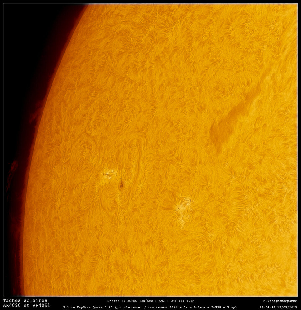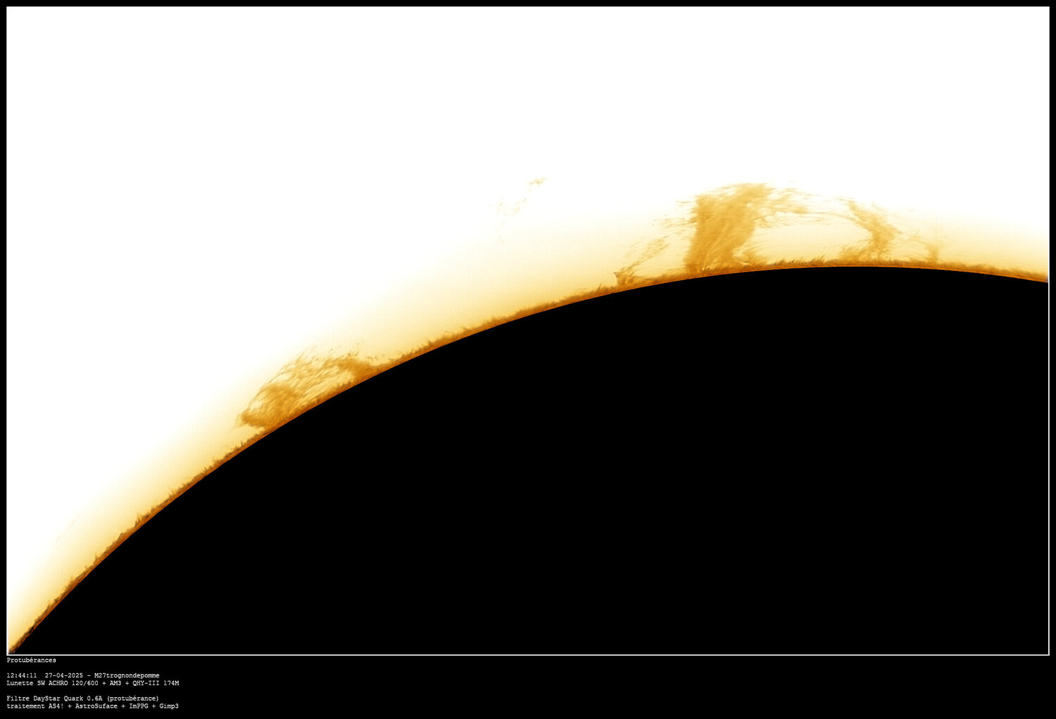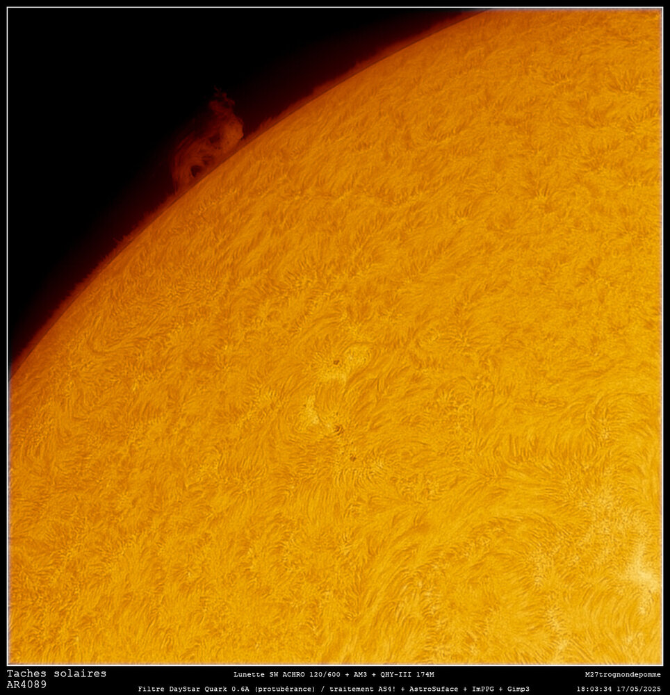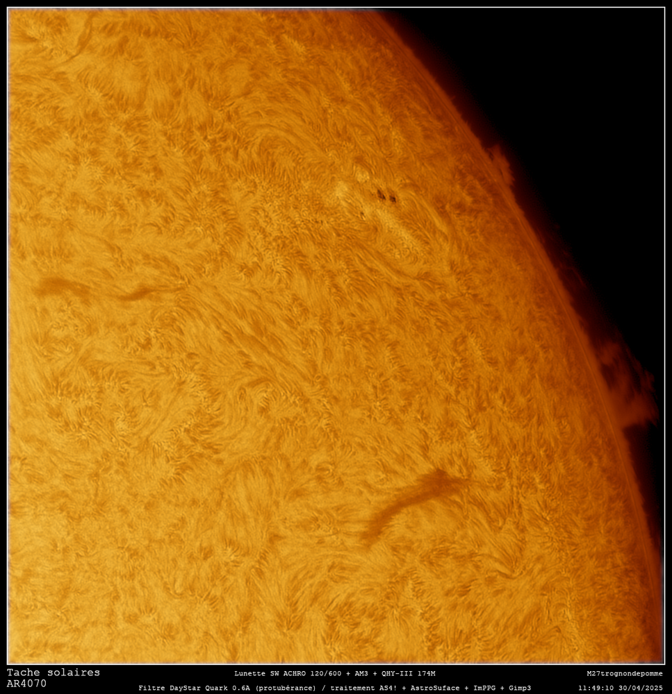 19h30 , il y a une belle trouée nuageuse mais le poteau sur lequel est posée habituellement la monture est à l'ombre. Du coup je pose grossièrement le trépied dans la pelouse et fit une mise en station à ma louche. Il y a un peu de dérive et j'ai croppé les images au traitement. J'ai imagé AR4100 et un e petite protubérance: -