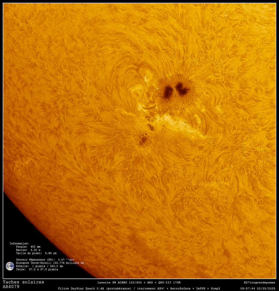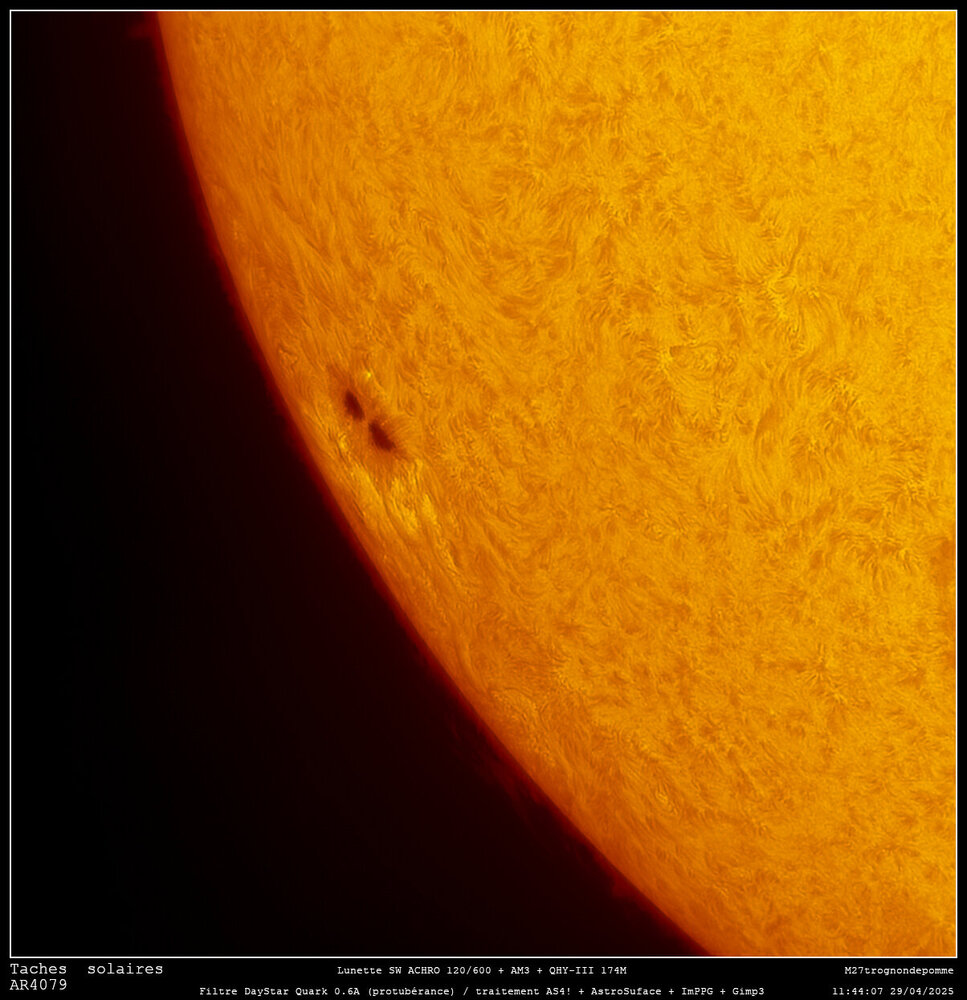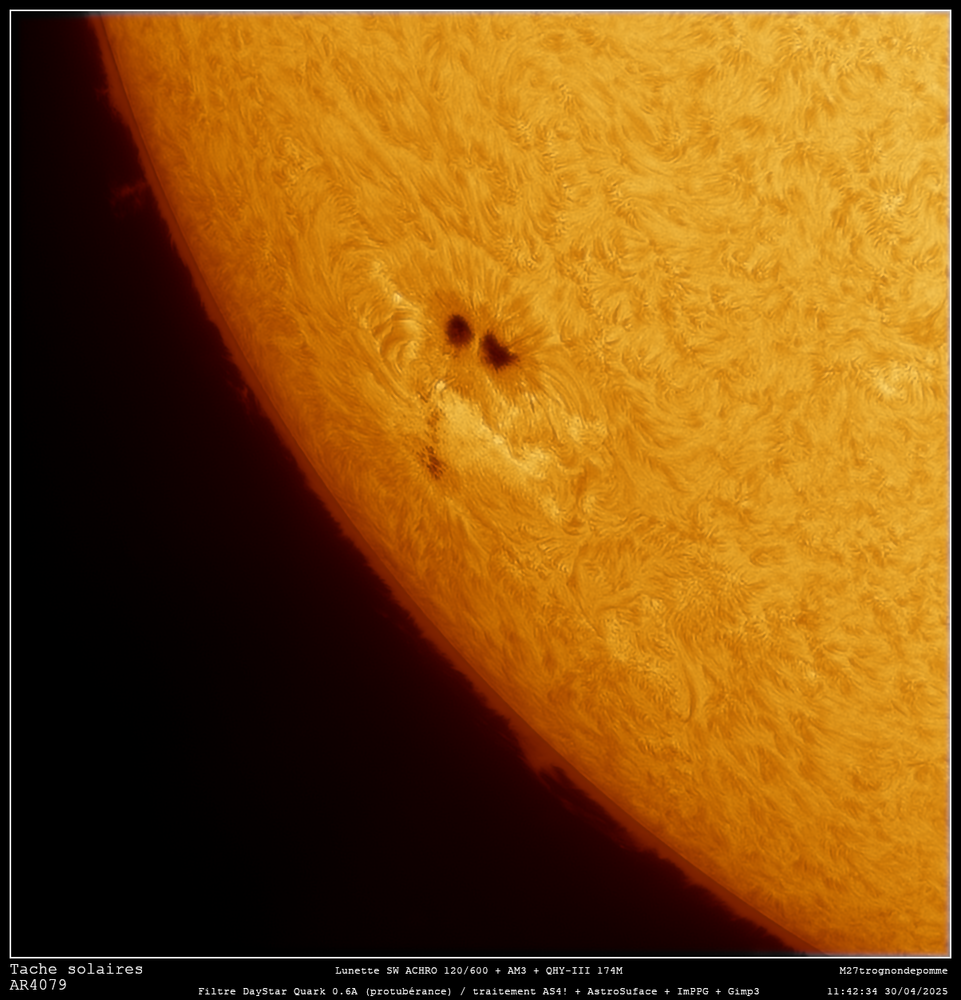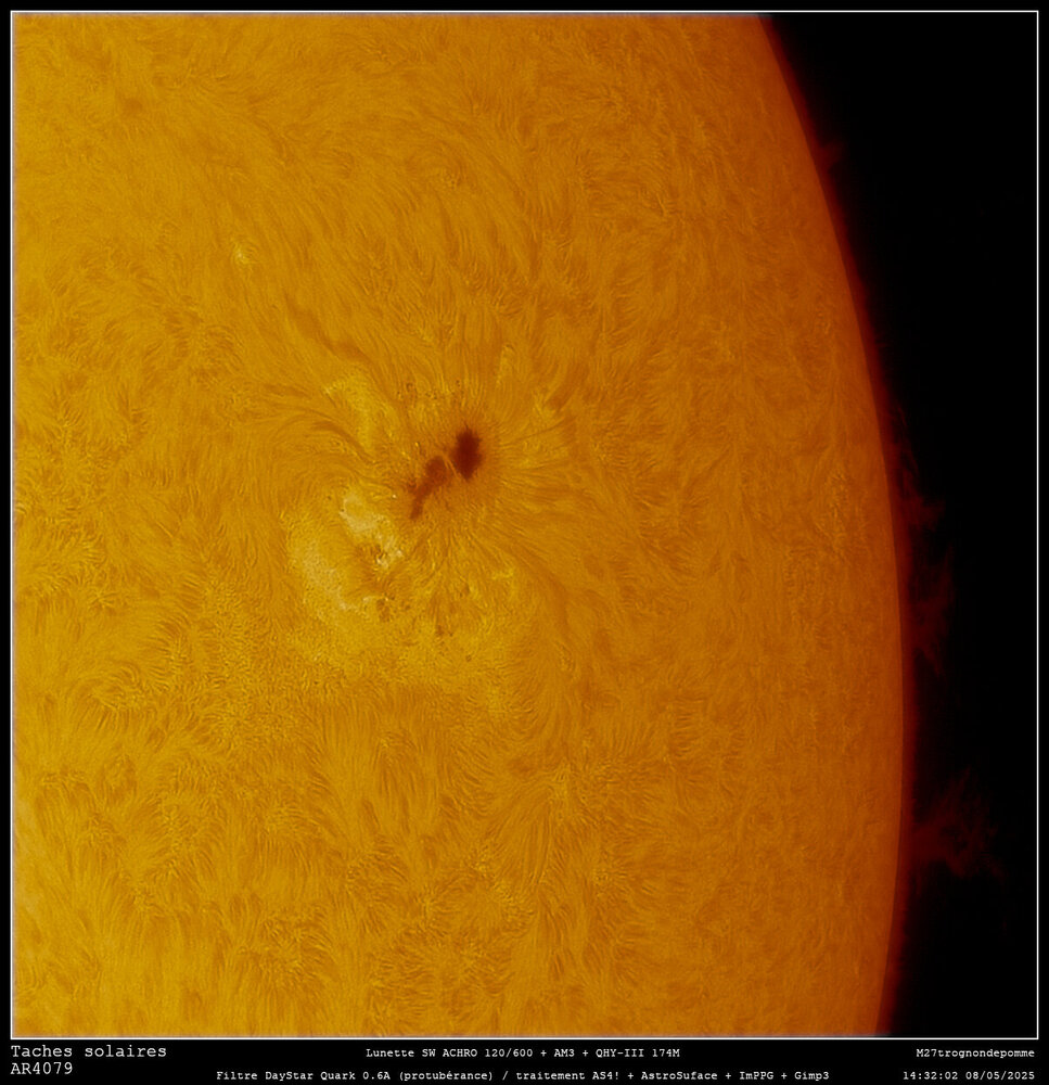 Une image du jour de la grosse tache AR4079 prise en Ha avec le Daystar Quark: 2 autres groupes de petites taches : AR4081 et AR4082 -