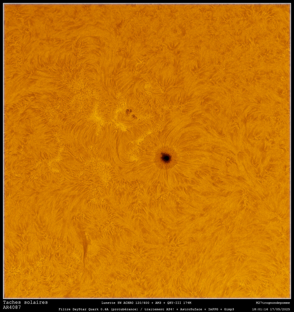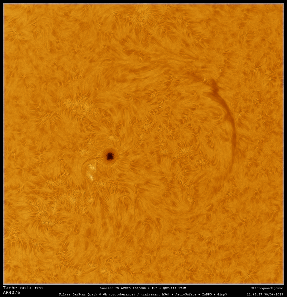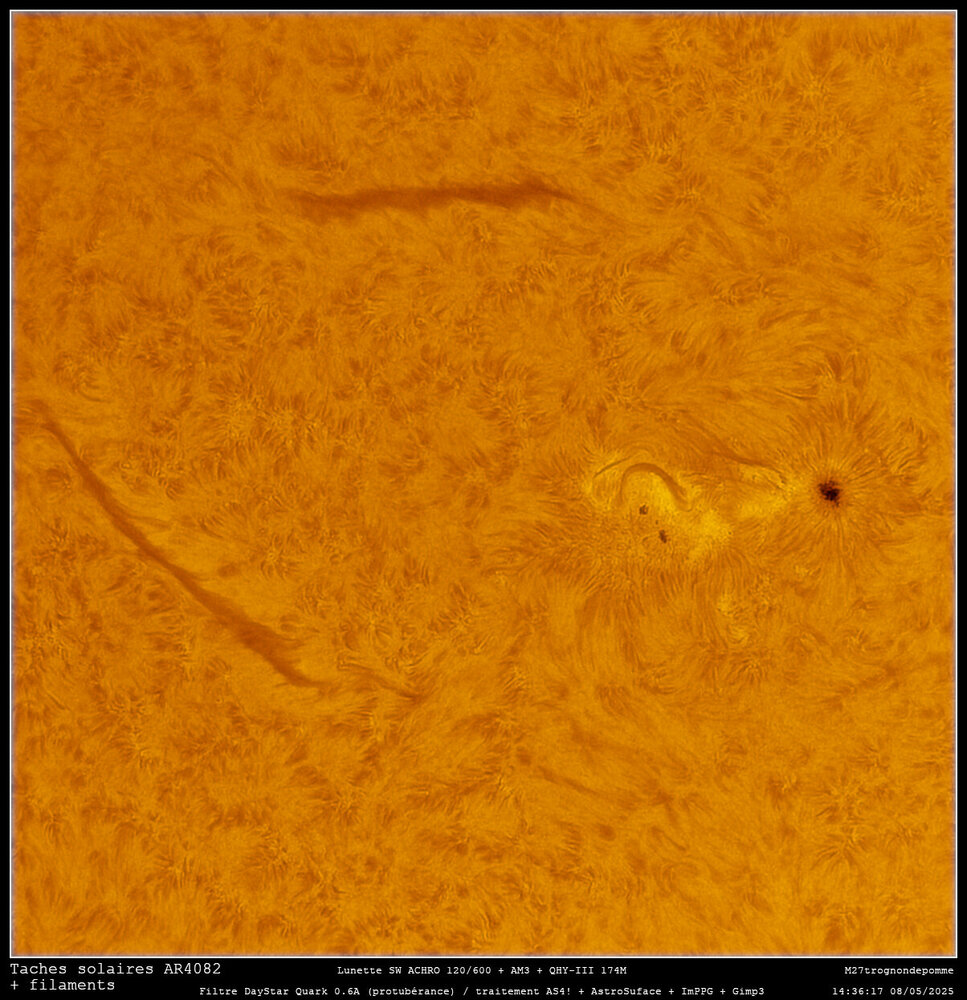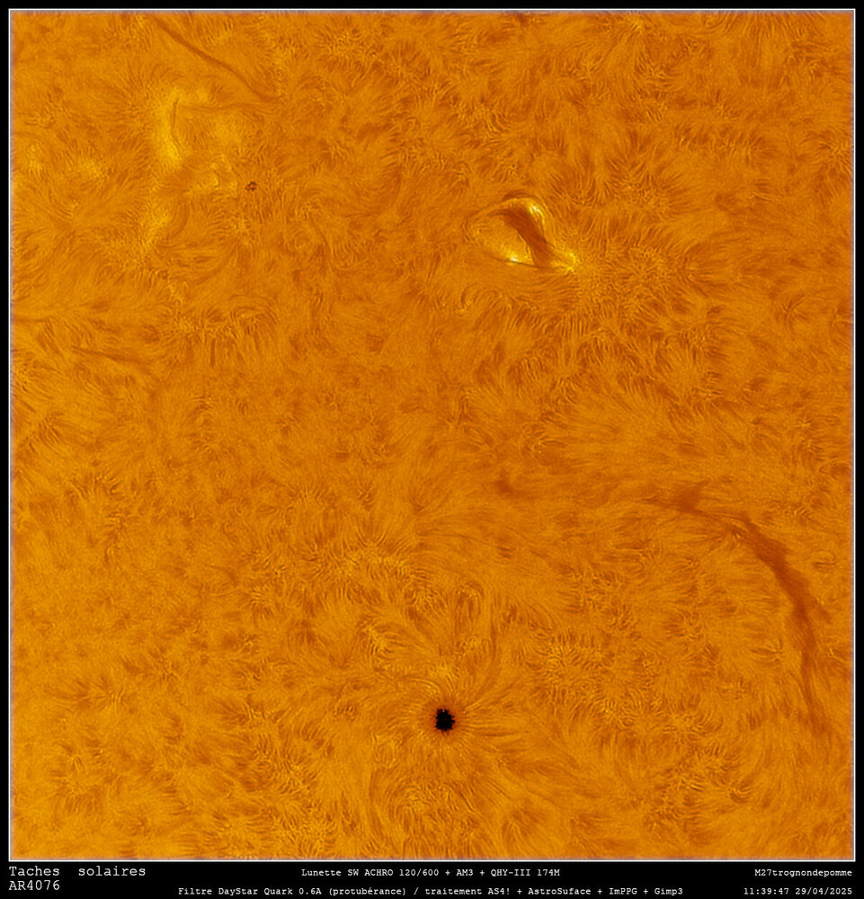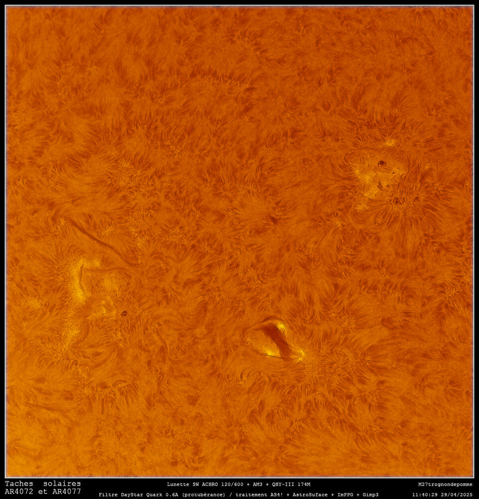 Une image du jour de la grosse tache AR4079 prise en Ha avec le Daystar Quark: 2 autres groupes de petites taches : AR4081 et AR4082 -