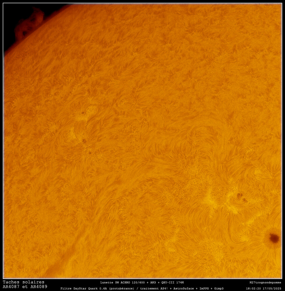 je vous présente une animation solaire (durée réelle 50min ) avec le groupe de taches AR4079 en avant plan et des protubérances en arrière plan. -