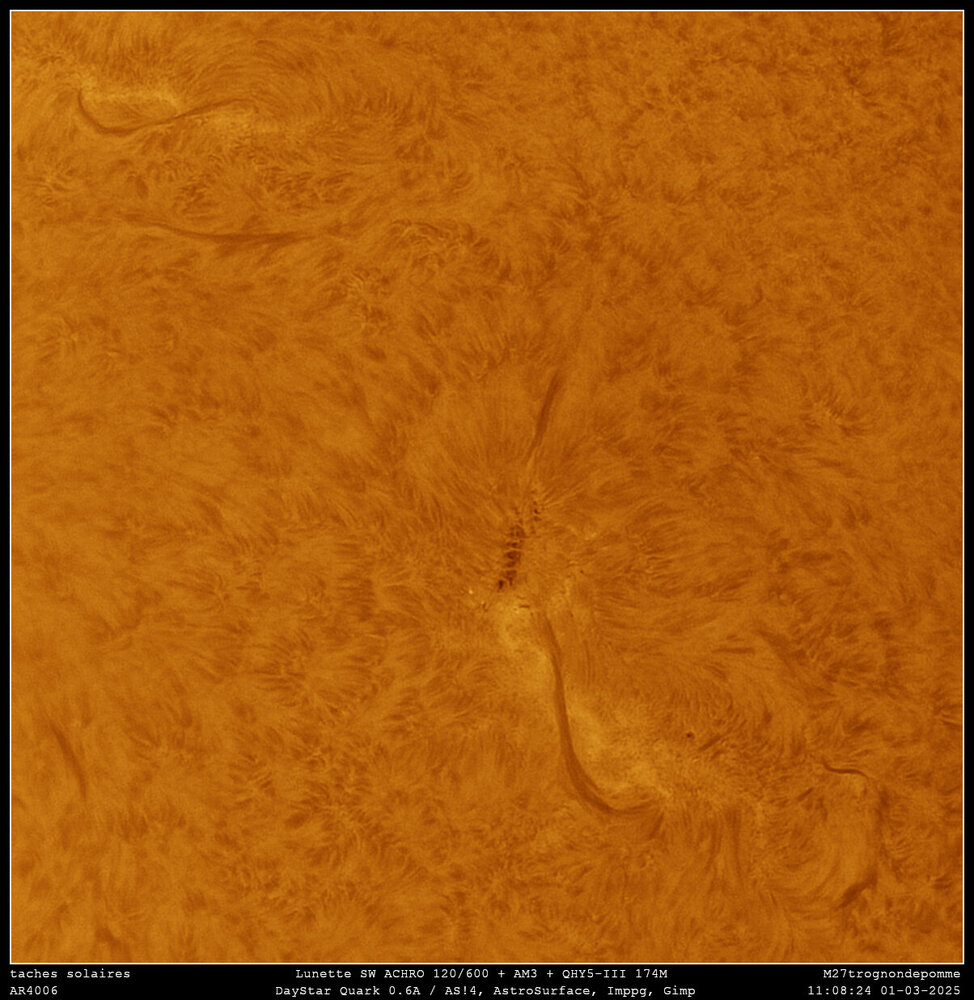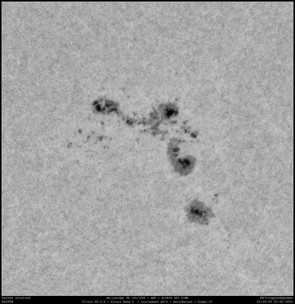 Dans une trouée nuageuse cet après-midi, j'ai imagé en lumière blanche (filtre Altair Band G ) les groupes de taches : AR3996 et AR3998. -
