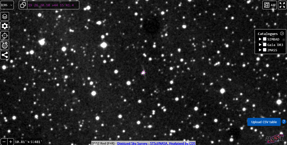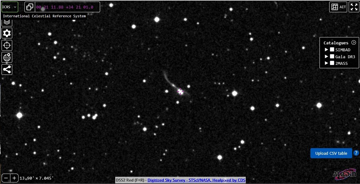 Bonjour à tous Aujourd'hui en me promenant sur stellarium je suis tombé sur un truc dont je n'ai aucune idée de ce que ca peut etre. Par recoupement j'ai pu le retrouver sur Aladin (je vous met le crop) j'ai meme utilisé Simbad pour essayer de trouver un nom. Sous Carte du ciel il est noté que c'est une étoile UCAC4-672-071855 alors je me suis dis c'est peut etre un artefact . Je suis donc entrain de faire une photo de ce truc (pour voir si cela apparait saussi). Alors meme si le temps est pourri (j'ai droit au nuage et je pense que le ciel n'est pas tres transparent) ca va faire 1h de pose et j'ai l'impression que ce truc apparait sur la photo (je vais poser 2h ou 2h30 en esperant que ca ressorte plus. J'ai dans l'idee que c'est une galaxie vu par la tranche collé a une étoile. Mais la je séche pour trouver ce que c'est (le ciel est vaste). Demain je mettrai l'image que je fais en ce moment. Pour l'instant je vous laisse avec le crop d'Aladin et le lien. https://aladin.cds.unistra.fr/AladinLite/?target=19 26 20.097%2B44 15 41.38&fov=0.06&survey=CDS%2FP%2FDSS2%2Fred Amicalement