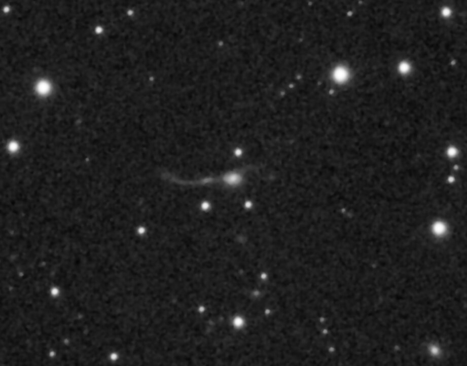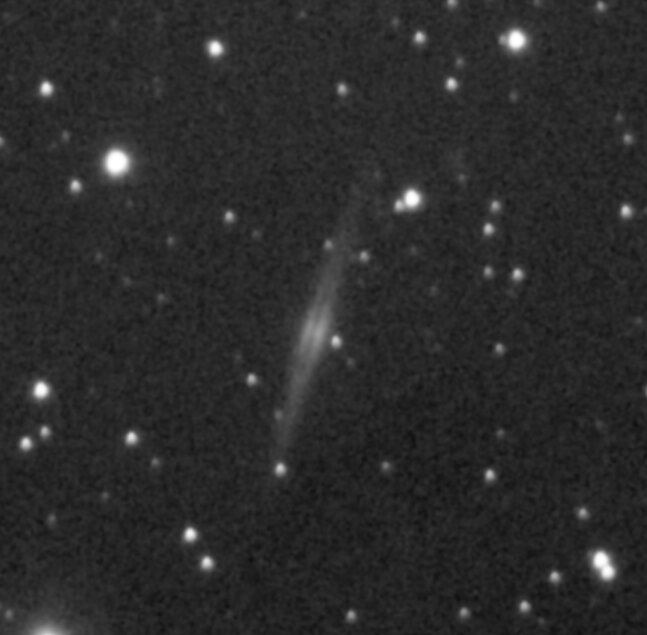 J'ai un C8 avec un reducteur de focale et j'arrive à 1400mm. Il ni a aucun filtre pour le coup. Carte du ciel me dit que l'etoile tout contre est de magnitude 16. Ca va mériter de retourner y faire un tour pour affiner les choses mais en regardant sous Aladin avec le catalogue Panstarr DR1 color on voit que c'est une galaxie sans bulbe vu par la tranche. Amicalement