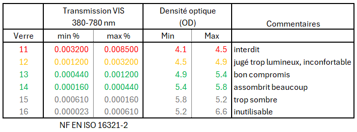 Pour info, la norme NF EN ISO 12312-2 sur la protection pour observer le soleil dit que la densité optique minimale pour assurer la sécurité est de 4,49 (transmission de 0,000032). Ça correspond aux verres de soudeur de grade 12. Tous les verres de soudeur filtrent les UV quasi complètement (heureusement vu comment la soudure explose en UV). Au delà du grade 6, les IR sont filtrés avec une transmission maximale de 1%, la norme précitée exige une transmission max de 3%. En annexe A, la norme explique que le grade 12, quoiqu’assurant la sécurité de l’œil, donne une image désagréable à regarder car trop lumineuse. Elle préconise donc le grade 13 ou 14 en précisant que le grade 14 donne une image quand même très sombre. Au delà de 14, c’est inutilisable. En pratique les grades 12-13-14 sont bons, le 13 est le meilleur compromis. Mais la logique du principe de précaution a retenu le grade 14… ça tombe bien, il est 20-30% plus cher que le grade 13, ça fait marcher le commerce ! -