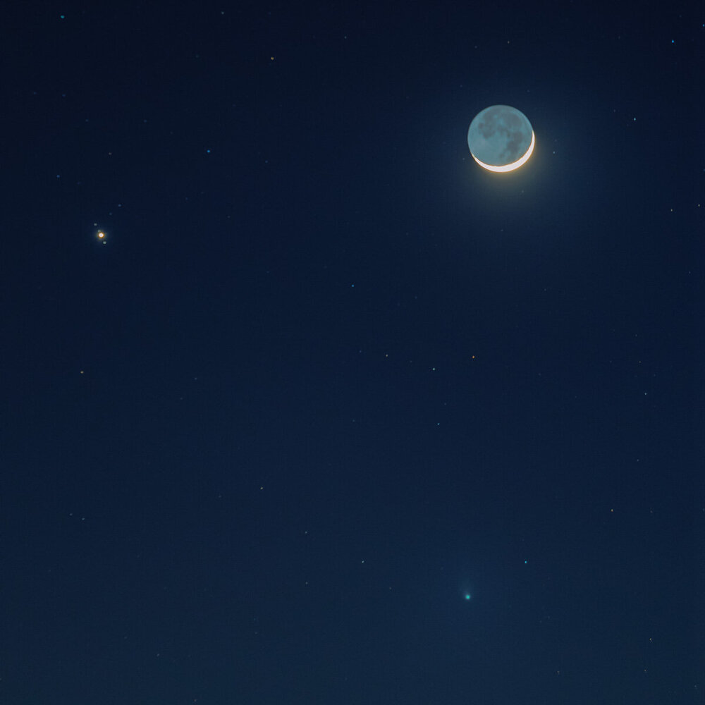 12. Le lendemain, la comète se trouvait entre la Lune et Jupiter. Canon R6 mk II Canon EF 70-200 mm f/4 L USM @ 200 mm 10 poses de 1.3 s à 800 ISO Empilement manuel avec Photoshop PS: et un petit pb de mise au point…