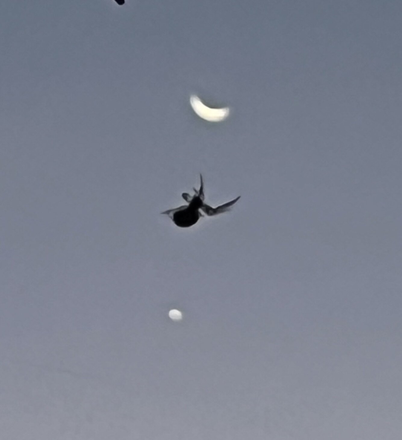 Retour sur l'occultation... À 13h58, un gros nuage d'altitude a eu la malheureuse idée d'occulter l'occultation. Je suis sûr que c'est l'araignée qui l'a appelé, la bougresse. Et t'as beau occulter l'occultation, tu te prends quand même un coup dans l'occulte. Ensuite, réunion sur réunion, boulot quoi... donc retour à 16h30. Mais allez trouver un croissant de Lune avec une étoile à côté en plein jour avec un ciel brumeux... Au bout de 15 minutes, j'ai enfin trouvé les deux copines avec les jumelles. Un nuage qui passait m'a permis de me repérer pour pointer mon téléobjectif sur elles. L'appareil photo étant sur un trépied, pas de goto, ni de disque gradué, tout au jugé d'après le réparage aux jumelles sur la forme du nuage. Je prends une série de 13 poses de 1/8000s, avec un Canon R6-II, objectif Sigma 70-200/2.8 x 1.4, soit une focale de 280 mm f/4.0. Stack manuel avec Photoshop et voilà : Sauf que le nuage s'est évaporé en 30 s, pfuit, plus rien ! Et en voulant recadrer un peu, je perds les astres... Alors je tente au jugé et miracle, elles étaient encore dans le cadre, mais juste dans un coin. Tant pis pour la coma... Cette fois ci j'ai 21 photos. Voilà, fin de la session. A+ Fred -