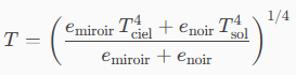C'est de la thermodynamique. Tout objet échange de la chaleur avec son environnement, surtout par rayonnement (comme la chaleur que l’on sent près d’un feu). La température d’équilibre est atteinte quand l’énergie reçue est égale à l’énergie perdue. Une surface avec une forte émissivité (comme le fond noir) rayonne beaucoup de chaleur, donc elle se refroidit vite. Une surface avec une faible émissivité (comme le miroir) rayonne très peu, donc elle garde mieux sa chaleur. La chaleur part toujours du chaud vers le froid, donc le miroir va perdre très peu de chaleur vers le ciel (la température du ciel est très faible). Au contraire son fond va échanger rapidement de la chaleur avec le sol, qui est toujours plus chaud que la température de l'air (si l'air est plus froid que la température d'equilibre du sol, qui est normalement de l'ordre de 10-12°C), donc il va "prendre" de la chaleur au sol, chaleur qu'il ne pourra pas rendre au ciel car l'autre face l'en empêche. Bref, la face vers le ciel a une émissivité très faible, donc elle perd très peu de chaleur vers le ciel froid. La face vers le sol reçoit de la chaleur du sol (plus chaud que le ciel). Ca maintient donc le miroir un peu plus chaud que la température ambiante. La température d'équiibre s'obtient avec : Pour emiroir = 2%, enoir = 96%, Tciel = 240 K, Tair = 5°C = 278 K et Tsol = Tair + 2 K = 280 K, on a la température d'équilibre : T = 6.2 °C Si on ne mettait pas de surface noire au dos, on aurait le verre du miroir : emiroir = 2%, edos = 33%, Tciel = 240 K, Tair = 5°C = 278 K et Tsol = Tair + 2 K = 280 K, T = 5.0 °C On voit donc que la surface noire au dos permet de gagner environ 1°C par rapport à la température ambiante, ce qui suffit à limiter l'apparition de le buée dans de très nombreux cas. Voilà aussi pourquoi c'est très mauvais de recouvrir les faces du support du secondaire et des pattes de l'araignée avec des revétements à haute émissivité... sauf bien sur celles visibles depuis le PO, que ce soit directement, ou après réflexion sur le primaire. -
