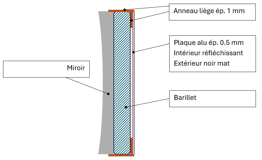 Si j'interprete bien ma pensée voici le truc qui pourrait être fait au dos du primaire, reste à voir comment placer le système, soit entre le barillet et le miroir, soit derrière le barillet. Et pour les pare-buées et dessiccants : Aucune électronique dans tout ça, rien qui puisse tomber en panne la nuit où, Murphy oblige, le seeing est passé en dessous de celui de l'Atacama ! Pour le secondaire : - recouvrir le support de surface réfléchissante - isoler le dessus du secondaire avec du liège, et recouvrir le liège de surface réfléchissante Pour l'araignée : - recouvrir les pattes de surface réfléchissante Puis peindre en noir mat toutes les surfaces réfléchissantes ainsi ajoutées sur le secondaire et l'araignée visibles depuis le porte oculaire, soit directement visibles, soit par réflexion sur le primaire. Normalement rien que les 2 parebuées seront déjà très efficaces... -