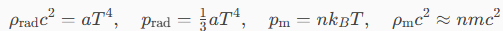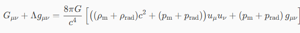 La réponse est simple, pour un gaz relativiste on a (notations habituelles) : avec : Légende des symboles : Gμν : tenseur d’Einstein (courbure de l’espace‑temps) gμν : métrique Λ : constante cosmologique (énergie du vide) uμuν : quadri vecteur‑vitesse du fluide ρ : densité d’énergie (divisée par c², on parle parfois de densité de masse) p : pression n : densité de particules (m⁻³) m : masse d’une particule kB : constante de Boltzmann a : constante de rayonnement =7,5657×10−16 J.m^−3.K^−4 T : température G : constante gravitationnelle c : célérité de la lumière dans le vide CQFD -
