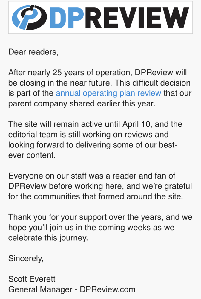 Ce qu’il faut savoir, c’est que DPReview avait été racheté par Amazon en mai 2007. Et Amazon a fait une coupe claire dans ses branches jugées non primordiales à ses intérêts. DPReview en fait partie… voici la justification envoyée aux employés d’Amazon : En conclusion, DPReview fermera ses portes le 10 avril 2023. Si vous aviez publié des revues ou autres articles sur DPReview, vous pouvez demander les données jusqu’au 10 avril à cette adresse : https://www.dpreview.com/data-download