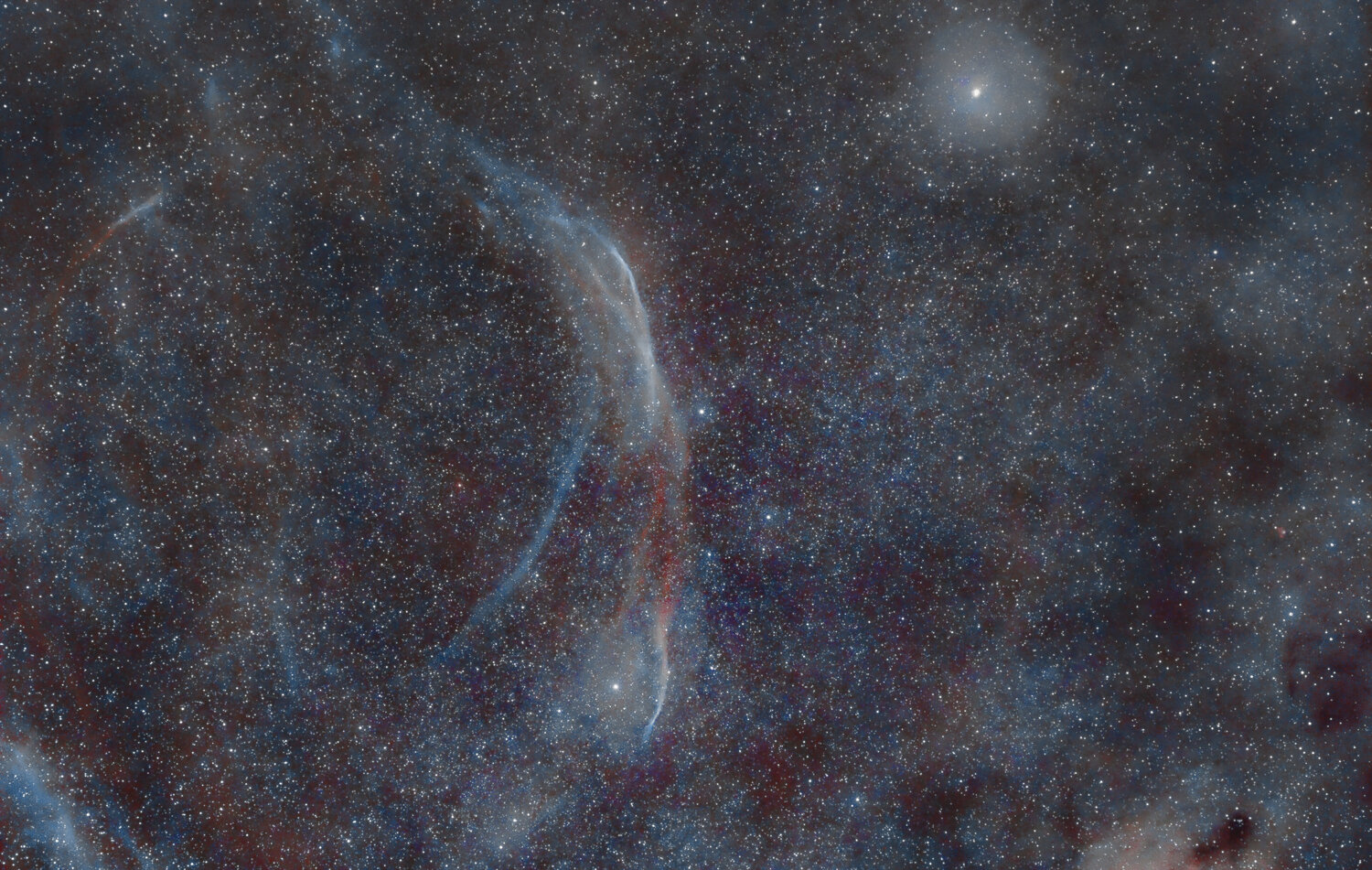 Bonjour à tous, J'ai voulu tenter SH2-91, les "autres" dentelles du Cygne, situées à côté d'Albiréo. Moins souvent imagées, elles sont faibles, peu contrastées, et cachées derrière un mur d'étoiles. Dit comme ça, ce n'est pas très engageant mais je me suis dit que ce serait l'occasion de faire des prises de vue un peu plus longues que d'habitude, en plusieurs sessions, et de voir ce que ça rend avec mon matériel... Ça se passe donc dans la tête du Cygne, en bas à droite : Pour les conditions de prise de vue : - Samyang 135mm f/2, à pleine ouverture - Filtres Baader HighSpeed Halpha et OIII, 4 heures par couche par tranches de 2 minutes - ASI183MM pro (-10°, gain 120) - HEQ5 Rowan - Guidage au chercheur 30/120mm Le tout piloté par Kstars/EKOS. Pré-traitement Siril, traitement Siril et Gimp Les couches après prétraitement, on ne voit pas grand chose entre les étoiles Et la composition HOO après traitement : Verdict : - Content d'avoir pu les sortir, ce n'était pas gagné d'avance - Cadrage à améliorer pour la prochaine, je n'étais pas sûr que l'ensemble (avec la partie gauche SH2-96) entre dans le champ, du coup j'ai centré sur l'étoile 9 Cyg pour être certain d'avoir tout l'arc principal. - Faire davantage de poses, le bruit est encore bien présent. - Et travailler le traitement, pas évident de décoller ces filaments du fond du ciel. Le halo autour d'Albiréo n'est pas très esthétique non plus... N'hésitez pas si vous avez des conseils !