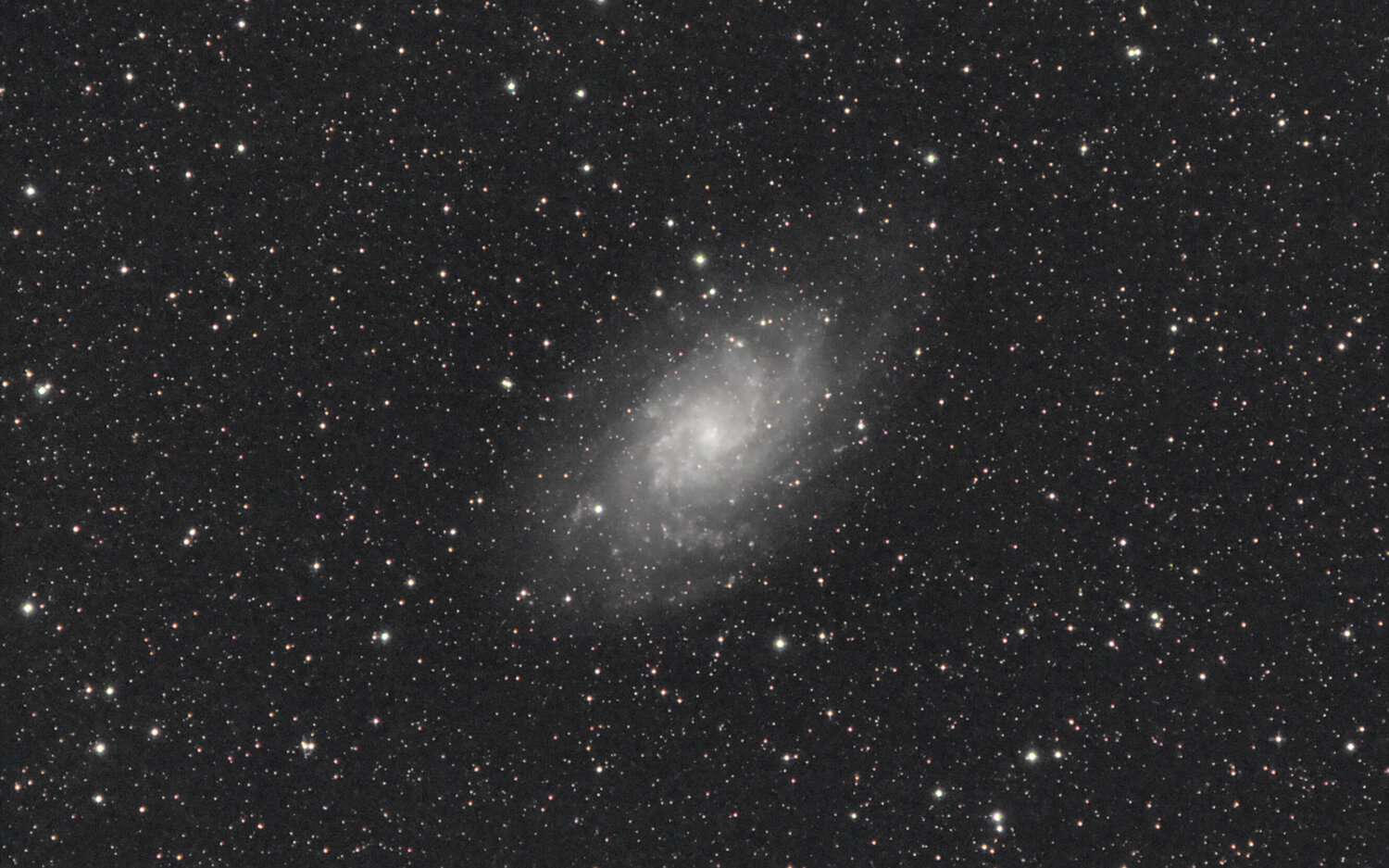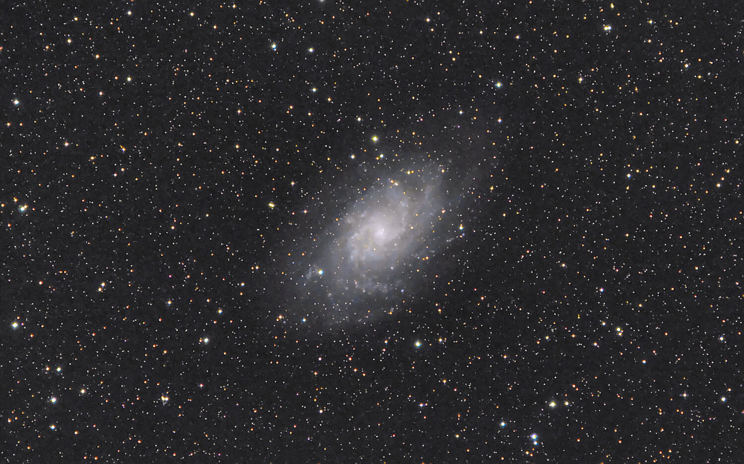 Bonjour à tous, Le beau temps est revenu sur le sud-ouest, j'en ai profité hier soir pour shooter M33 au Samyang. Côté matériel : Samyang 135 fermé à F2.8, ASI183MM pro, filtres RGB, HEQ5 Rowan, guidage au chercheur 30/120. Côté poses: 120 poses de 30 secondes par couche, soit 3h en tout. Pilotage au chaud avec KStars/EKOS (Raspberry Pi avec distribution AstroArch). Pretraitement Siril, finition sous Gimp (niveaux, légère réduction d'étoiles, crop) et Darktable (réduction bruit astrophoto). Je vous la présente à l’échantillonnage natif, j'ai juste fait un crop des bords pour ne garder que la partie centrale de l'image. N'hésitez pas si vous avez des remarques pour m'améliorer