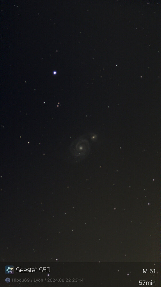 Bonjour, le duo M81/M82 et M51 en images brutes transmises du Seestar, toujours sous le ciel pollué de lumières de Lyon mais avec un Bon seing (je suppose) et sans vent !
