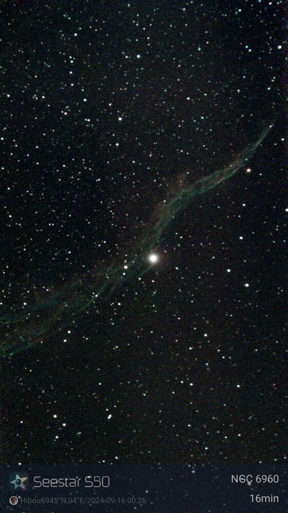 Bonjour, bon je le mets à genou devant mon Seestar. Car avant hier, j’avais une lune bien remplie illuminant le ciel, ajouté à la pollution lumineuse du centre de Lyon et voici ce que j’ai quand même pu obtenir en brut, la petite dentelle NGC 6960 😘 Voici mes conditions d’observation ! C’est full Lights 🙄