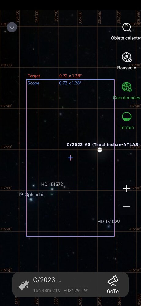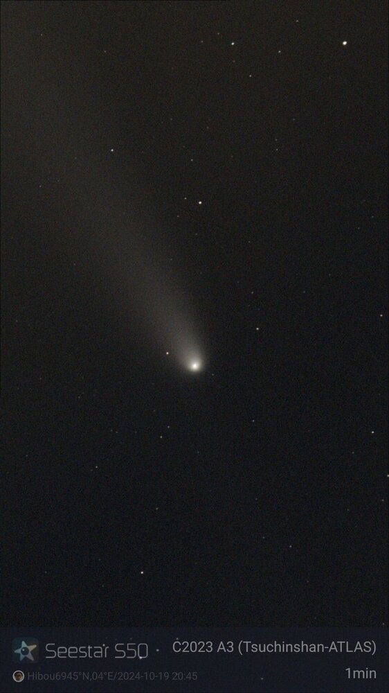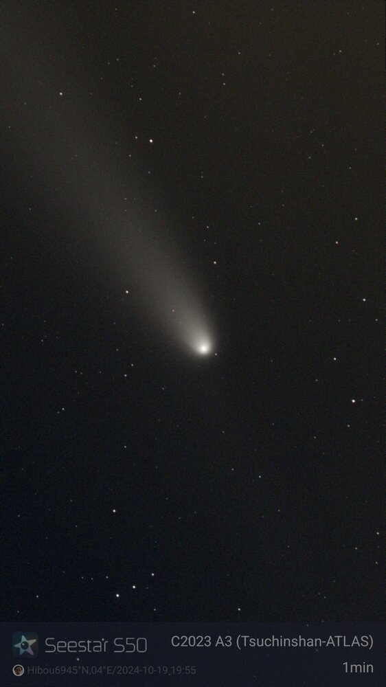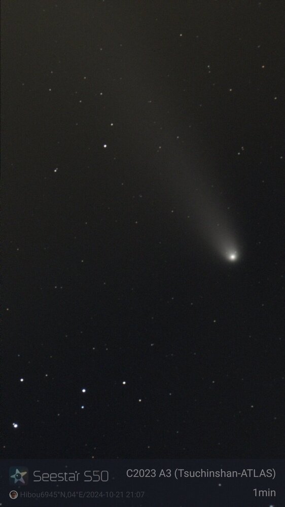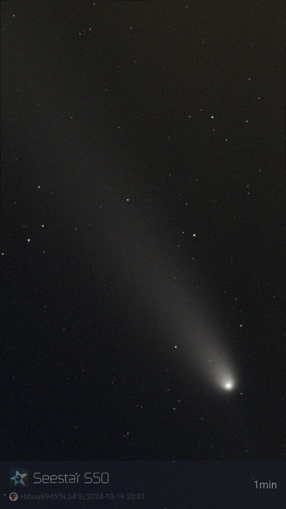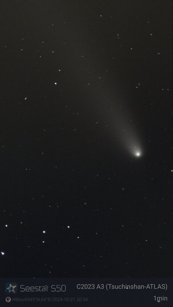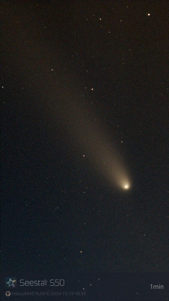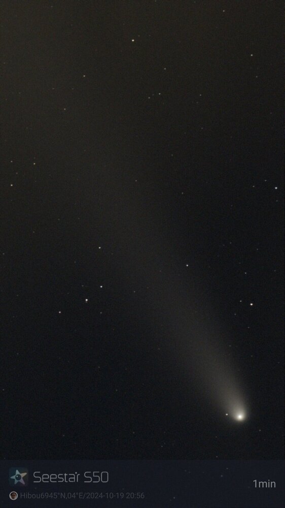 Vraiment très belle cette photo prise à Agde, avec plus de contraste ! Sûrement dû à moins de pollution lumineuse que pour moi à Lyon. Par contre il me semble que 5 minutes de pause est trop dans le sens où cela allonge le noyau de la comète dû à son déplacement. En effet le seestar compense la rotation terrestre mais pas celle de chaque comète spécifiquement. Donc la comète de deplace et cela ce voit sur ́les photos du seestar et cela ne correspond plus trop à la réalité. J’avais fait aussi du 5 minutes mais j’ai trouvé qu’au delà de 1 minute max 2 minutes on ne gagne plus rien si ce n’est que marquer le déplacement de la comète. Enfin c’est mon analyse suite à mon vécu ! Sinon hier j’ai pu sur une 3eme soirée de suite immortaliser la comète passant près de HD151372 et HD151029. Ça apporte un truc assez sympa ☺️