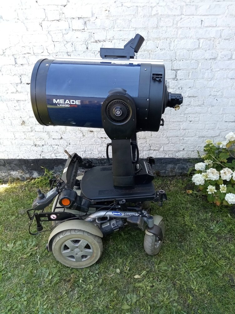 18. Bonjour, Je voulais juste partager une bricole Je voulais un gros tube facilement "bougeable", autant dire une contradiction. J'ai vu sur cloudy un meade 16" sur un fauteuil roulant électrique. J'ai trouvé un storm3 valeur 3000€ pour 180€... Il est usé mais fonctionne. J'ai fait un trou dans le siège et voilà ! J'ai posé mon meade 14" et .... Ça roule, c'est super car je peux le sortir en 5 minutes désormais. A vos fauteuils, le bon coin est fourni en occasion. 180€ c'est une affaire mais pour 300, 350€, vous avez un système qui fonctionne. Vu le poids d'un fauteuil, ça bouge pas trop. Un ajout de cales ou autre et c'est parfait...