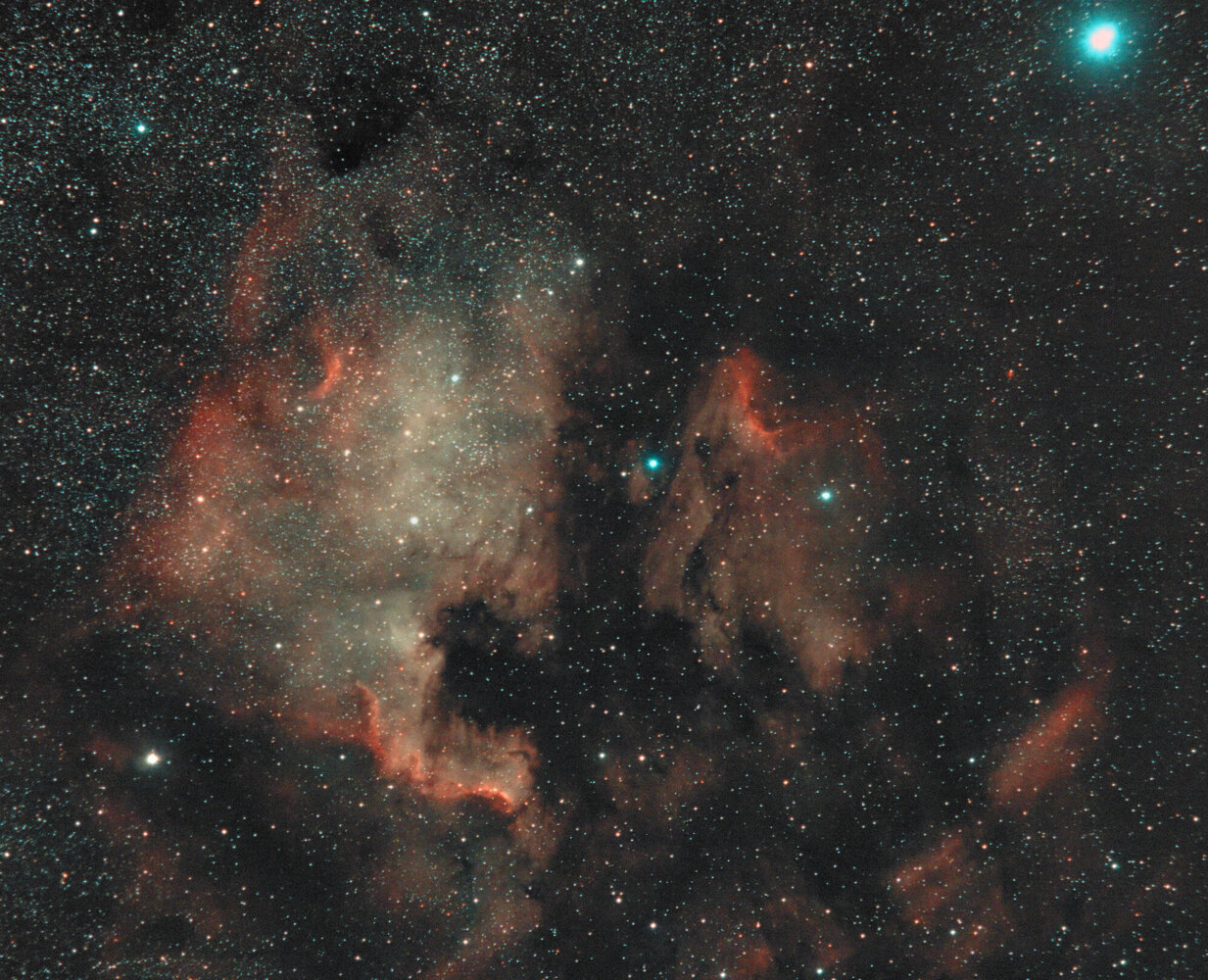 L'Amérique et le Pélican [Poséidon-C, lulu TS 60/330 @x0.8, filtres duo Ha/OIII et SII/OIII]