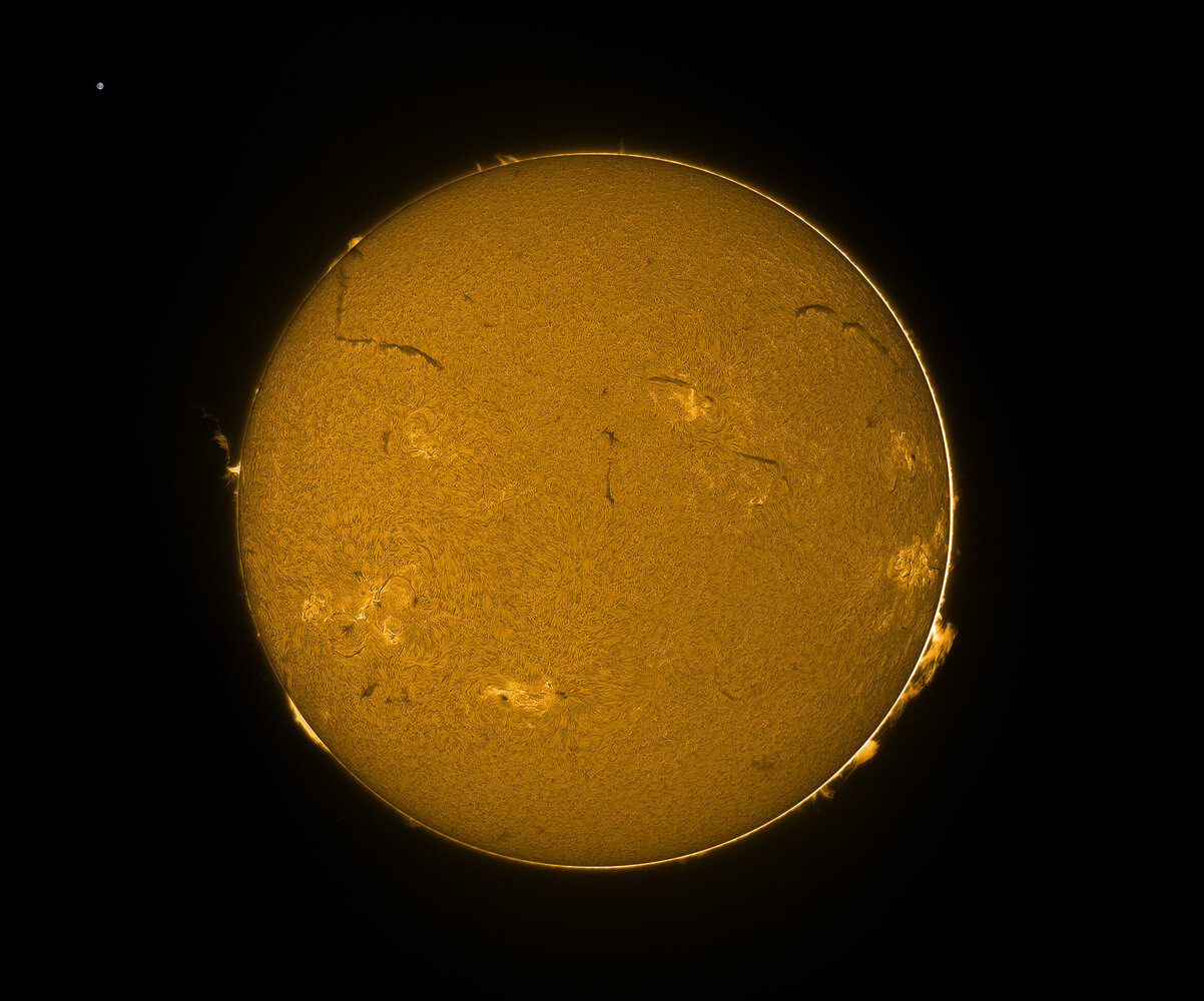 merci à vous oui, oui, 40mm la première image est faite à l'aide de deux films : l'un avec le gamma à 60 pour avoir le disque très contrasté (mais protus quasi invisibles), et l'autre avec un gamma autour de 20 et un temps de pose plus long pour bien faire apparaitre les protus ( pour le coup, le disque est saturé). Je mixe ensuite les deux films pour l'image finale. La seconde image, par contre, est faite qu'avec un seul film avec un gamma autour de 40. Le résultat est proche de ce que j'observe à l'oculaire... même si en visuel, je vois un peu plus les protubérances et les filaments sont un peu plus contrastés. a+ stéphane -