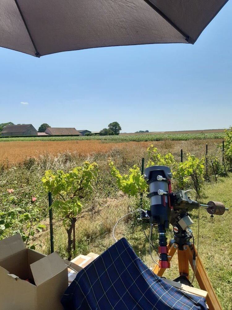bonsoir à tous, samedi dernier, j'avais un peu mieux préparé mes acquisitions pour une grosse animation que pour les fois précédentes : mise en station la veille pour limiter la rotation de champ, rajout d'un clicklock au bout de la powermate pour éviter un éventuel tilt, un contrôle plus régulier de la mise au point et surtout, surtout .... un parasol ! au Mak 102/1325 muni de son D-ERF , powermate x2.5, quark combo chromo, ADC et zwo178mm en binning x2 478 films de 600 images toutes les 30s entre 12h44 et 19h14 HL acquisition et autoguidage avec firecapture 2.6 traitements AS!3, photoshop, registax 5.1, iris et virtualdub2 Gif à 10img/s réduit à 63% ( 63Mo ) XVid réduit à 85% ( 20Mo ) http://www.astrosurf.com/ls35dx/new58/S20230624-10h44UT-17h14UT-DERF-mak102-powerx2.5-chromo-adc-asi178mm-b2-r85.avi a+ stéphane-