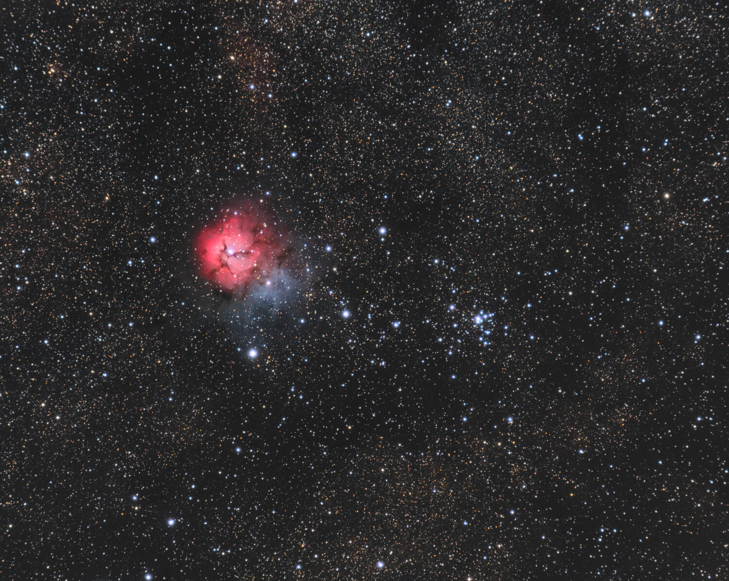 bonsoir à tous, Grâce au beau temps actuel , j'ai repris le traitement de mon stock. Voici donc M20 et M21 pris cet été dans la nuit du 9 au 10 Aout depuis l'observatoire Sirene sur le plateau d'Albion. Atik460ex + filtres LRVB astronomik + fs60 à f/6.2 sur GP-DX autoguidage en // avec zwo178mm + zwo30F4 L : 20 x 300s en binning 1x1 RVB : 7 x 180s en binning 2x2 prétraitement imageviewCA, siril traitements siril, starnet, photoshop, graxpert Annotation Siril : a+ stéphane