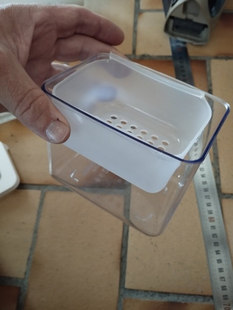 La lumière naturelle et/ou un stockage au sec... Pour la cantine à deux étages qui protège ma lulu, j'ai fabriqué un petit boitier déshumidificateur et glisse à l'intérieur un galet déshumidificateur premier prix que je trouve par deux chez Auchan. J'ai aussi à l'intérieur un petit hygromètre. Le déshumidificateur régule pile poil à "normal" l'humidité dans une pièce humide voire à 40% (sec) si je n'ouvre pas la malle pendant un bon moment. Impératif : que ça ne se renverse pas et c'est pour cela que c'est stable, coincé par des cales et il y a un couvercle avec des trous au milieu mais étanche sur les bords. Quand la male sort en extérieur j'enlève le déshumidificateur et le met en attendant dans une poche plastique de congélo pour qu'il n'y ait pas d'humidité. Ma lulu a été trimbalée depuis plus de 20 ans ainsi dans des régions d'Outre Mer très humides. Par deux fois j'ai renversé le contenant avec le liquide récupéré c'est très corrosif heureusement ça n'a jamais touché la Lulu et j'ai du refaire l'intérieur de la malle... d'où ce bricolage récent qui permet une grande stabilité de la boiboite. C'est certes plus préventif que curatif. En photos : -