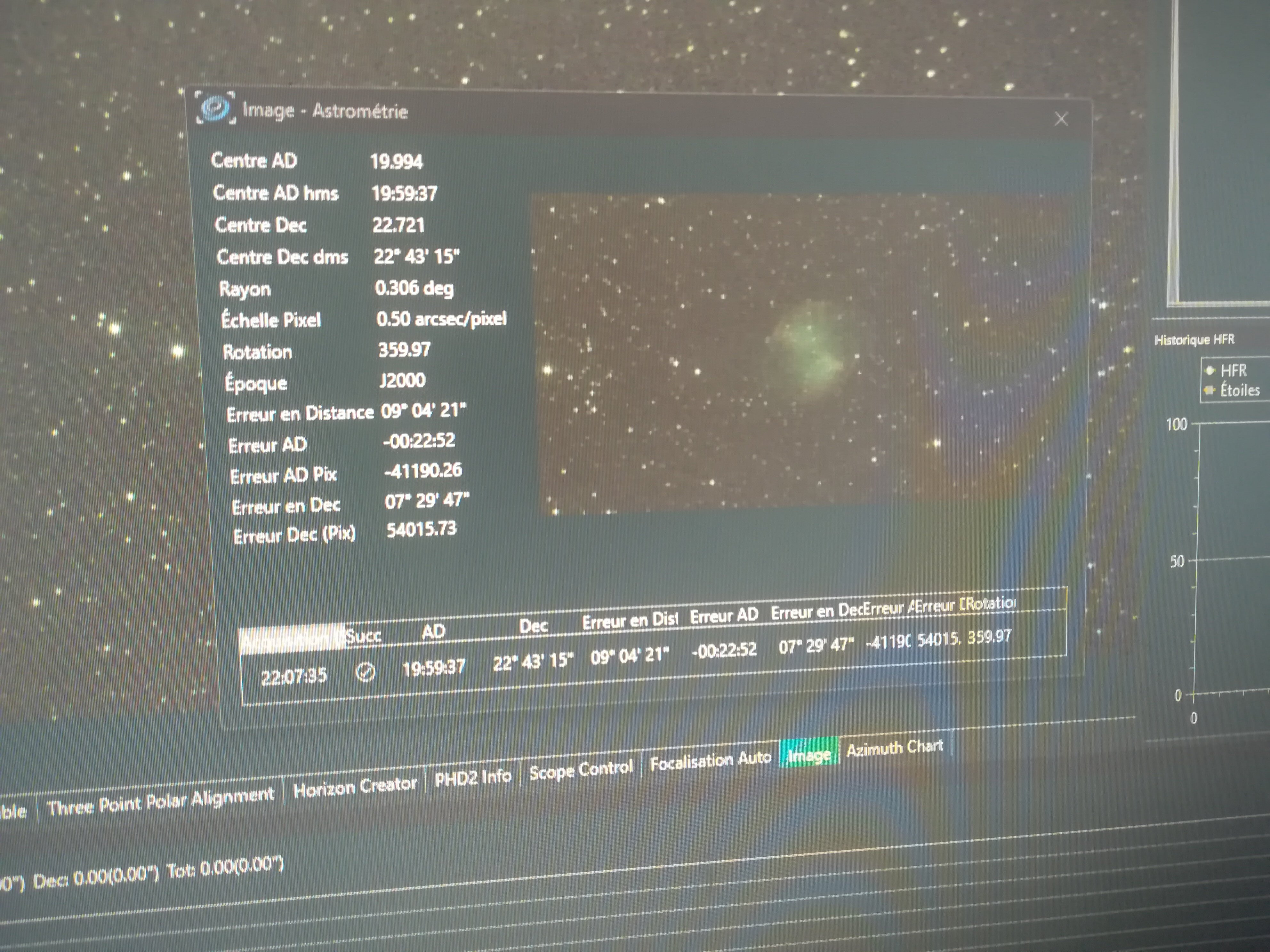 5. Bonjour Je souhaiterais savoir comment modifier un paramètre de NINA qui est proposé en début de configuration de profil , mais que je ne le retrouve pas dans les menu Il s'agit d'une boite de dialogue qui propose "Telescope to nina" ou "nina to telescope". J'ai choisi: " telescope to nina" (sans trop savoir) Le problème c'est que je me retrouve avec des erreurs en astrométrie qui font que je ne peut pas pointer au coordonnées. Quand je pointe a partir d'un objet de l'atlas du ciel, puis assistant de cadrage cela fonctionne Lorsque je rentre des coordonnées l'assistant de cadrage Il pointe au coordonnées de EQMOD Lorsque je pointe M27 pas exemple en partant de l'atlas du ciel, puis assistant de cadrage il trouve bien M27 grâce à l'astrométrie EQMOD affiche les coordonnée décalé par rapport au coordonnées réels soit -00 22 52 en AD 07 29 47 en DEC Je ne sais pas si cela sera assez claire, n'hésitez pas a me demander des précisions ... Cordialement Eric