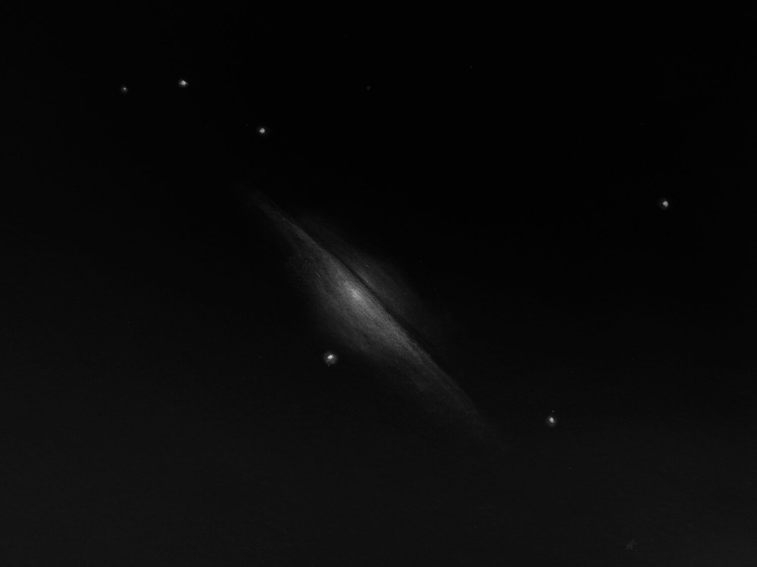 Soirée du 17 mai 2025. la météo n’était pas clémente dans les Pyrénées mais la motivation intacte, nous sommes allés avec un astropote ( @Floconoui ) plus au nord, dans une zone avex bien noire des Landes pour fuir les cirrus. Nous nous installons dans une clairière, et je découvre le nouveau Sud Dobson 460 f3,5 Mirrosphere du copain, une vraie beauté et drôlement bien foutue!! De mon côté, toujours pareil, Dobson 400 maison/miroirs mirosphere, sur table équatoriale. Le coucher de soleil est superbe, avec à l’est une magnifique ceinture de Vénus sur un ciel bleu profond sans aucun nuage mais avec des traînées d’avions très longues ne présageant pas des meilleures conditions. Nous observons Jupiter déjà très basse, malheureusement sans événement à ce moment. Puis Mars, qui ne montre que sa calotte bordée de son liseré sombre et quelques zones sombres. Pas possible d’exploiter plus que 300x, et encore…. Nous sommes bien loin des observations fulgurantes de notre coquinou national!! Le ciel ne s’arrange malheureusement pas vraiment et nous devons faire le deuil de grossissements corrects et d’analyse de détails dans les petites structures ….on restera dans les grossissements de 80 à 200x rarement 300x. Ainsi M99 et M100 ne m’en montreront pas plus ( et même moins) que dans mon jardin l’autre soir malgré un SQM très bon ! (21,5). Je dessine donc le couple 4302/4298 qui n’a de toutes façons pas de détails à montrer : Puis M104 qui ne souffre pas trop des conditions dégradées : Et enfin NGC3718 avec Hickson 56, qui ne me montrera que deux composantes allongées : UGC 6527 (mag15,79 et PGC 35620, mag14,6). Je n’ai pas réussi à observer PGC 35631 (mag16.16). ethos 13,8 et 6mm. (150 à 300x) Pour mettre les choses dans leur contexte, 3718 est à 55Mal, H56 est à 400Mal. Nous avons pu comparer M51 dans nos deux télescopes, le gain du 460 est discret mais bien présent! Puis sur M13, idem, mais le gain de la binoculaire est supérieur au gain du diamètre. Nous avons fini avec le Hibou et la Nebuleuse de l’anneau qui ne montrent pas grand chose malheureusement…. Nous avons dû abandonner à 1h en raison de l’humidité , mais la soirée était sympa malgré tout, d’autant que la dernière séance ensemble datait de mars 2024….