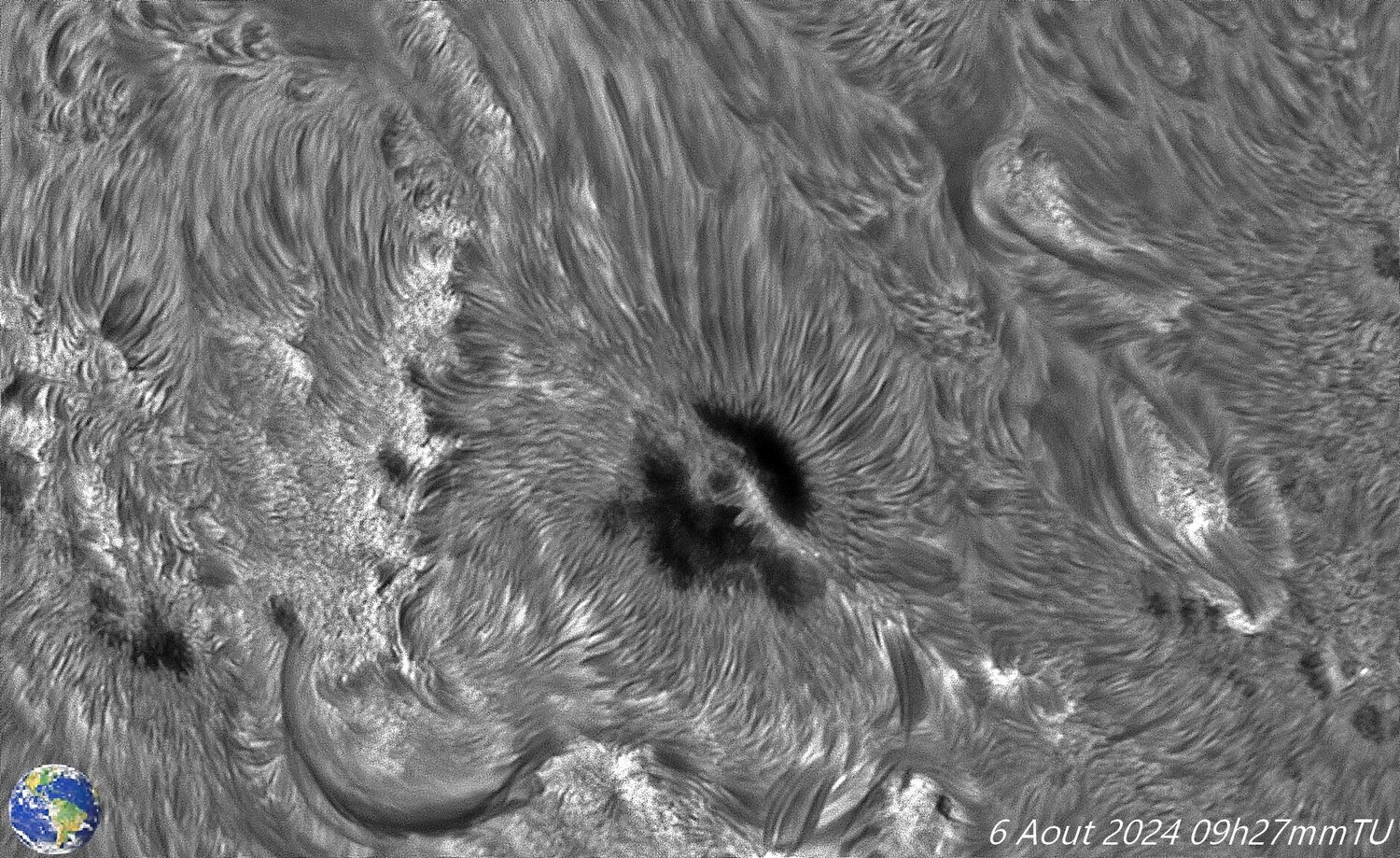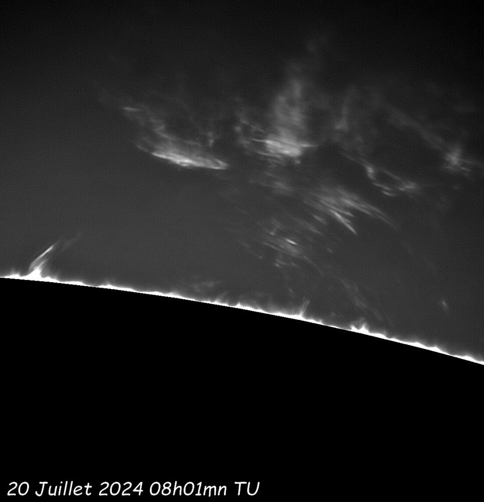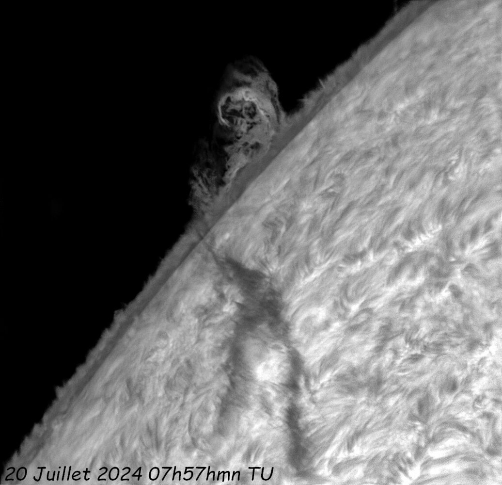 bonjour, ciel pas terrible ( vent d'autan )donc donc je continu mes essais . cette fois-ci D-erf + hélioscope + Barlow 3 et Bf 10 coronado seul sans ITF (en principe 5 Ä au mieux ) les protu sortent assez bien , si ce n'est que j'ai un reflet gênant de ce coté du disque solaire , il faudra essayer en tout vissé . gain 228 à 10ms pour la protu gain 9 à 9 ms pour la tache la largeur de bande est trop large pour voir les filaments sur la surface Paul
