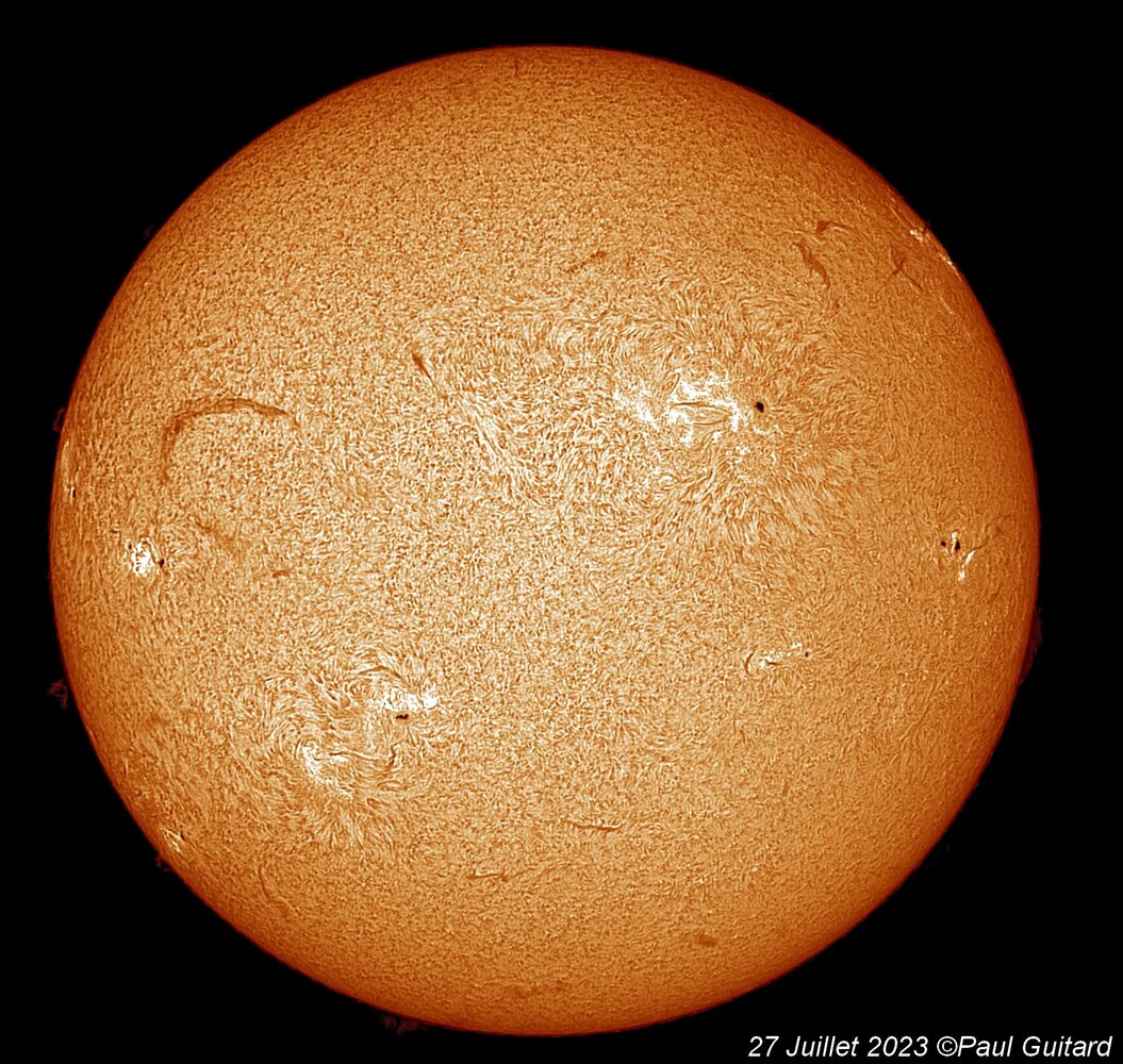 bonjour , j'ai eu un semblant de ciel bleu blanc vers 18h , mais quelle turbulence !!!!! donc avec le quark de la Solarscout démonté et adapté à la grosse Berta , sur échantillonné avec la ASI174 et le tirage . Paul à voir aussi en Full