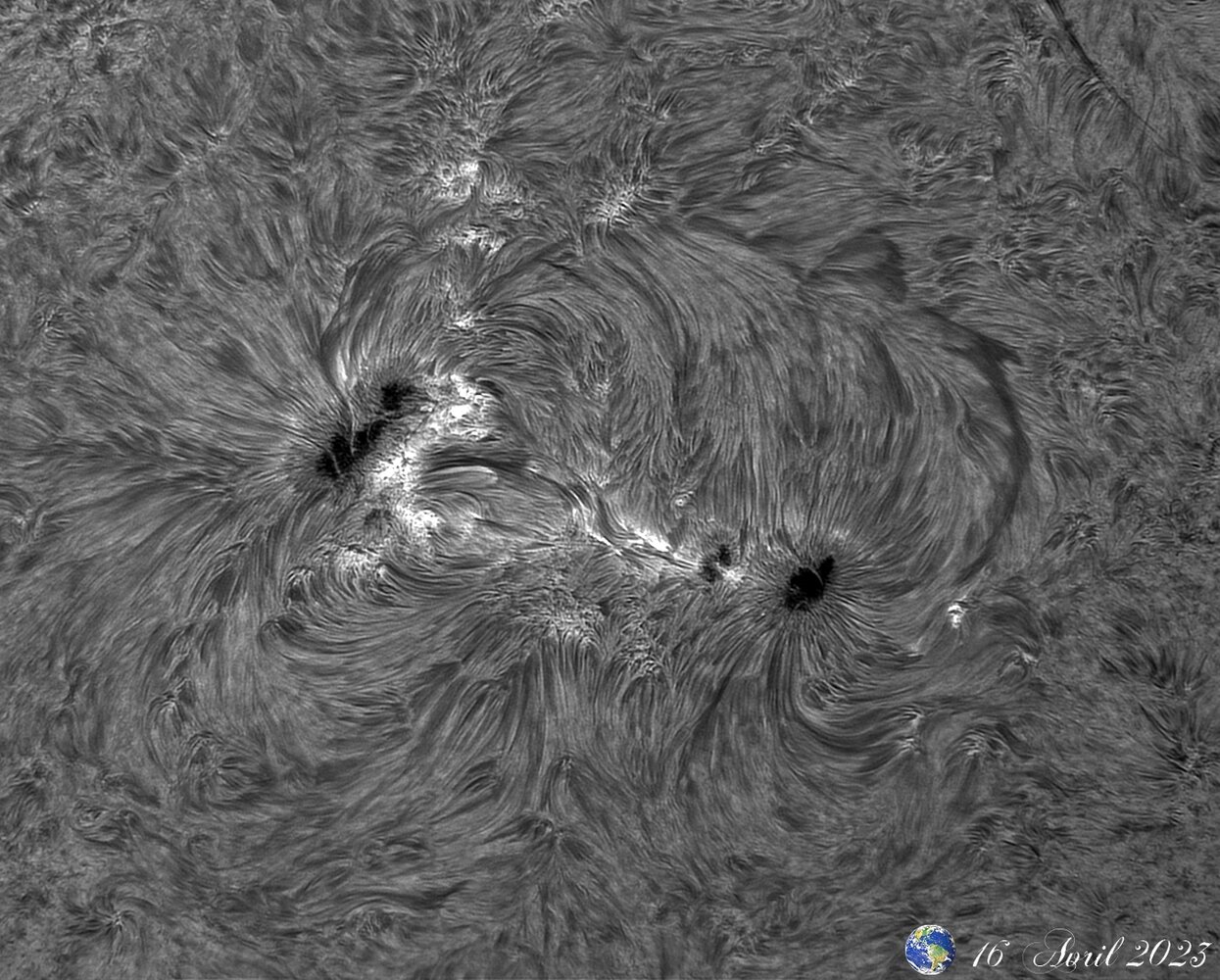 @rmor51 bon si ça fonctionne pas avec le soleil ici sur 5h sachant que la déclinaison bouge constamment ~1' /h soit 1/30 diamètre solaire en ce moment , ça a guidé sur une partie entre les taches ? je pratique comme ça depuis quelques années avec firecapture et ST4 , ça n'a pas la précision pour le Cp mais ça fonctionne . Paul le guidage avec une focale de 8.7m une petite idée du vent violent pendant les prises animation format réduit en taille de ~30% Valeurs exactes mesurées sur l'image : Diamètre Soleil mesuré (pixels) 9000 pixels Echantillonnage mesuré (" d'arc/pixel) 0,21 "/pixel Champ caméra V (" d'arc) 235 " d'arc = ~4' d'arc Champ caméra H (" d'arc) 342 " d'arc =~6' d'arc Focale mesurée (mm) 8734 mm Rapport F/D mesuré 42,81 Grandissement mesuré 4,85 x Kilomètres / pixel mesuré 155 km/pixel