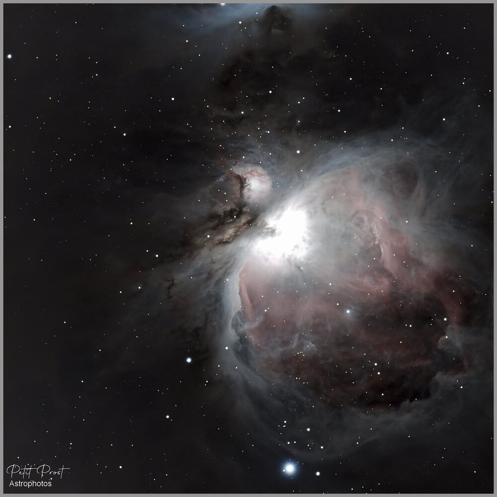 20. Bonjour à tous , Nuit glaciale ( -6° ) et claire , premier quartier de lune . Temps idéal pour tester le filtre SkyGlow sur la TS 100/580 et Asi 533MC , setup mis en place en vue des prochaines Galaxies qui s'annoncent . Il me fallait une cible encore accessible et pas trop compliqué à tester . 22 poses de 180 sec sur M-42 Prétraitement Siril Traitement soft sur PIX simplement en RVB sans Luminance , le cœur sature très vite Eric